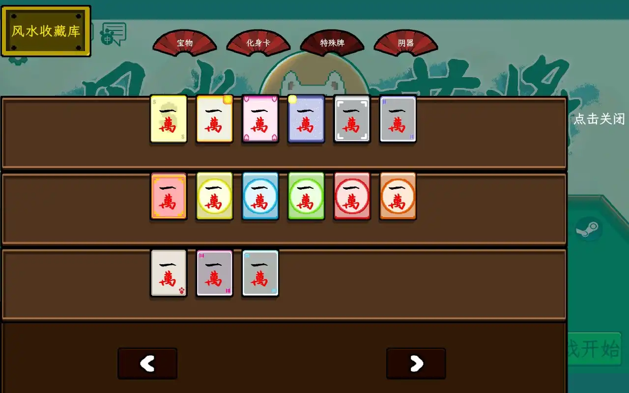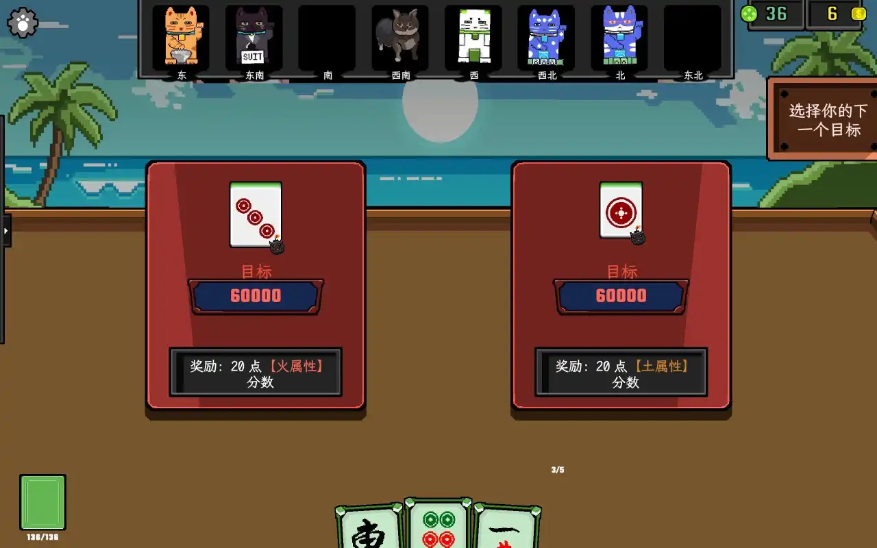 就是如上图,将33332共14张牌,利用各种花色的麻将组成相应的组合,例如碰,对子,吃这种,并且每张牌的分数也不同,不同组合获得的番也会不同,只要超过目标分数,就可以进入下一回合当然也可以配合上各种道具使用当众多的道具,宝物以及化身卡搭配起来之后,数字成倍成倍的加会非常爽「风水喵将」属于是听着容易,上手起来其实挺困难的那种,当你上手开始排列组合就知道其难度了还可以将牌替换成界面底下的牌,当然也可以弃牌(就相当于随机摸了一张牌)并且上方的八张宝物也是有讲究的,如何搭配都有说明,但合理的搭配使用才能够最大化,如果使用不好还会获得Debuff,也有可能会导致游戏结束