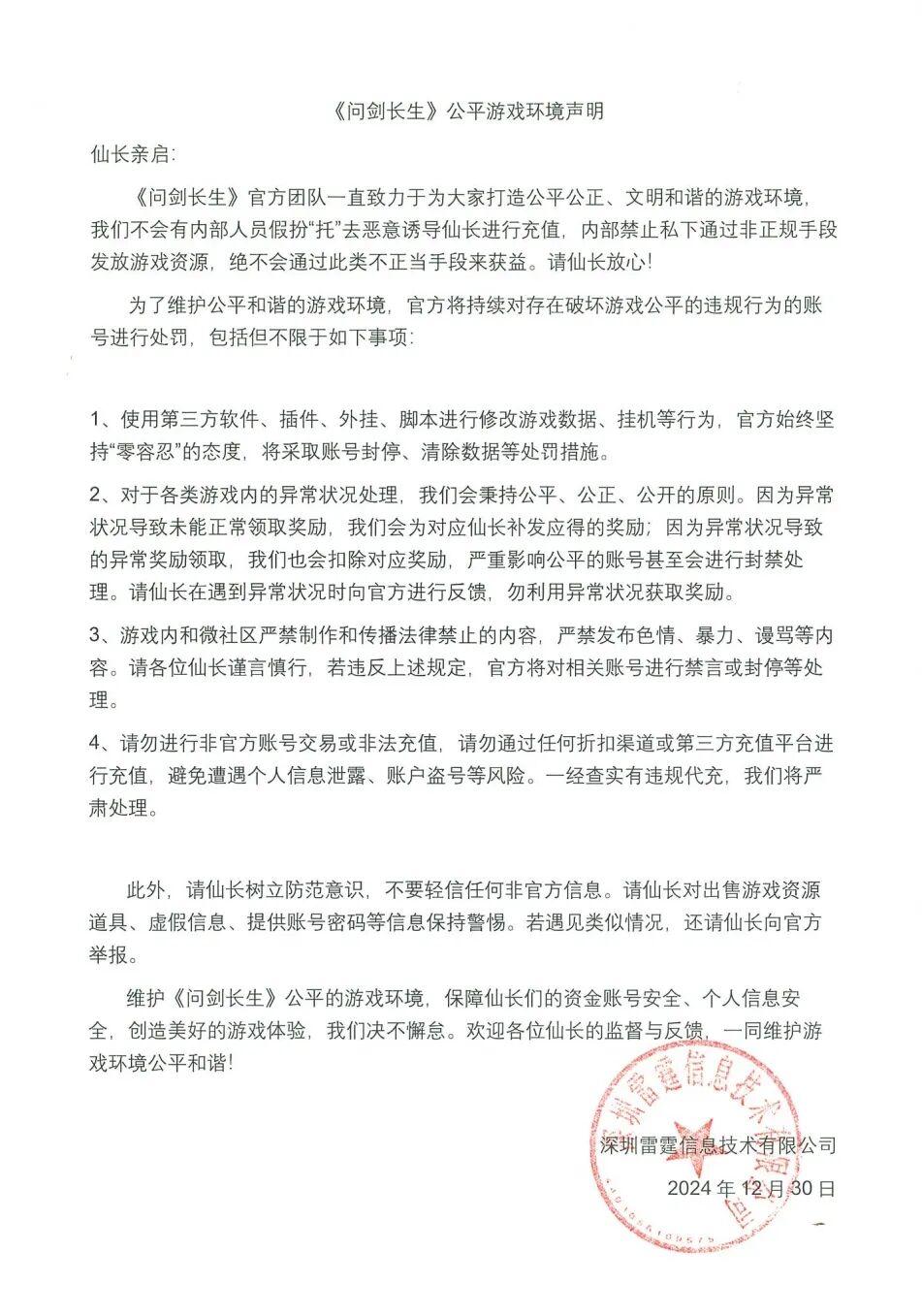 道法不偏,修为自得,我们呼吁所有仙长一起抵制违规行为,维护《问剑长生》的公平运转!《问剑长生》官方承诺,我们将继续努力,对违规行为持续监控打击,为所有仙长提供一个健康、公正的游戏环境!