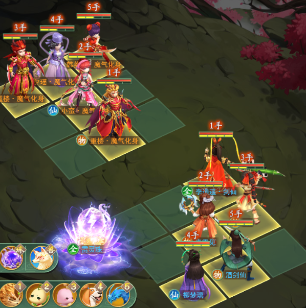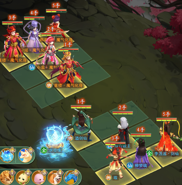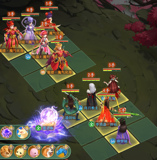 李逍遥(9号位):首回合尽力清掉对位的韩菱纱,后续回合使用“武神”主角技能,在解决普通重楼后,用“武神”清除魔楼神力,为我方解除来自他的巨大威胁。