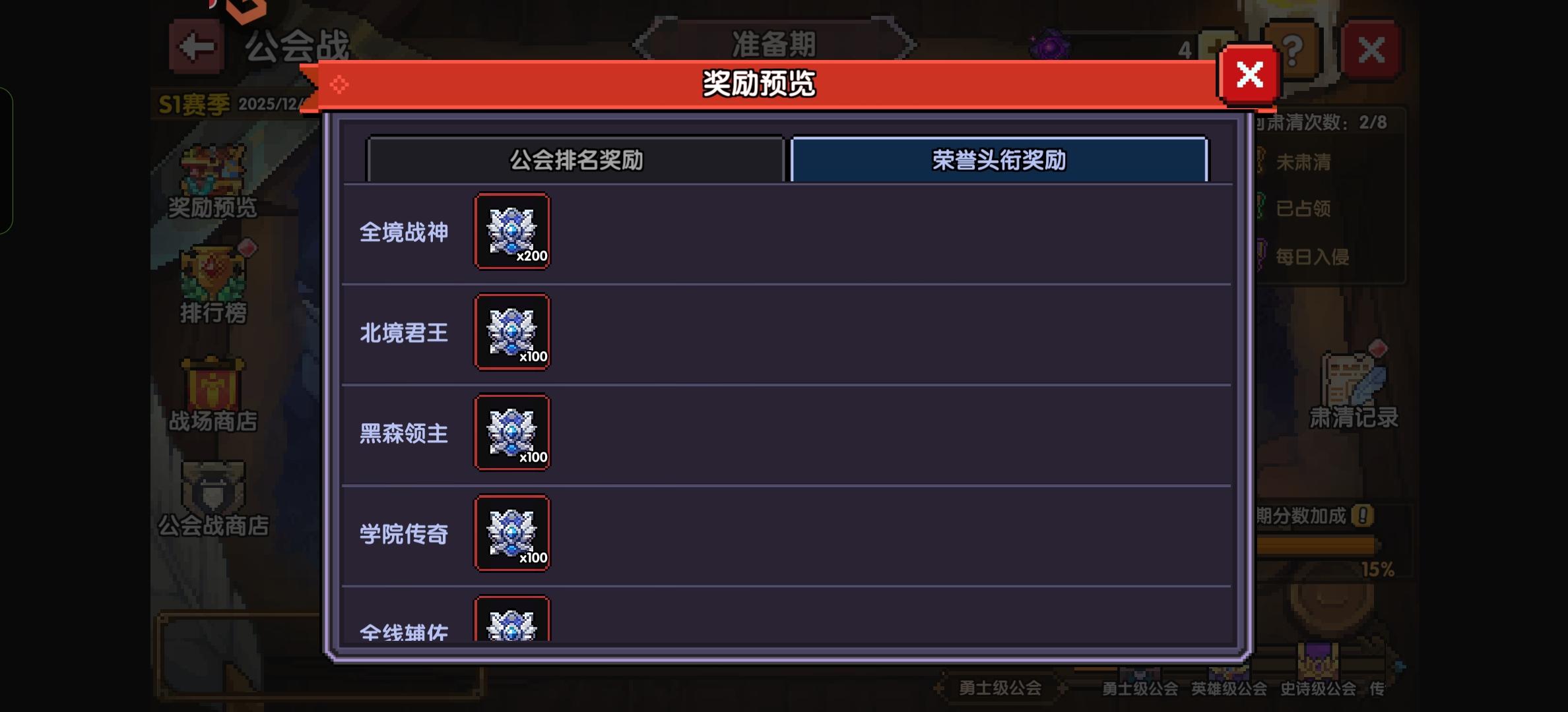 新公会战排名奖励【除了全境战神全部都是100个人功勋,全境战神为200个人功勋】
