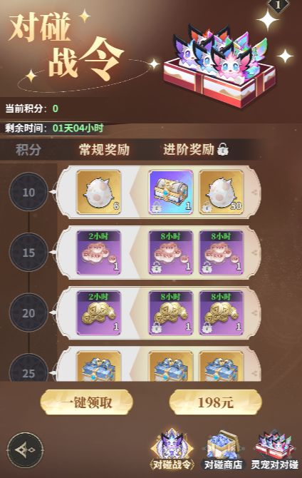 每期活动都有一个对应的活动战令,活动战令常规奖励无需购买就可以领取,只需要达到战令积分,解锁战令的进阶奖励后也有性价比相当高的内容,条件支持的情况下可以直接购入。战令获取的奖励都是能助力自己提升很高的战力。神眷宝箱可以根据自身需求进行选择,还有圣辉锦盒可以在部分养成玩法中进行抽奖补短。