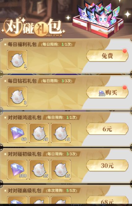 活动每日福利礼包可以免费获取一个灵蛋,钻石礼包可以获取三个灵蛋,这是相当于免费的获取的。接下来就是通过充值获取的灵蛋,每天可以购买一次6元的礼包,一共有30个灵蛋。还有每日30元可以购买三次的礼包。以上礼包内容是每天都会刷新。有条件的话活动期间可以全拉满用来兑换商品也是不错的提升。下面的礼包就是有限购次数并且当次活动买完就不会刷新,具体可以以游戏内礼包为准。