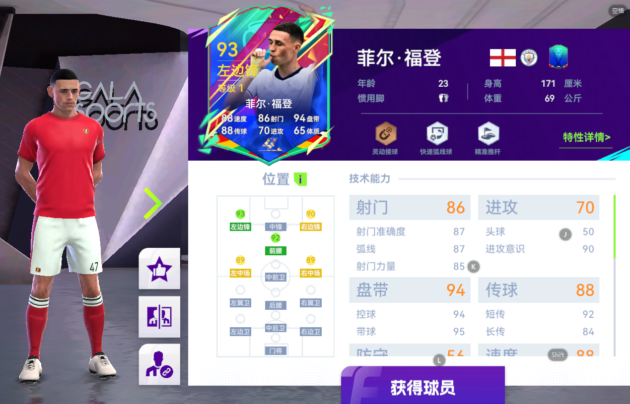 福登跟以上几人不同在于,曼城太子更偏向于终结,就跟现实中他踢球一下,在弧顶射门的威胁极大,同时他还带有快速弧线球和精准推杆俩特性,让他的终结效率更上一层楼;但他的组织能力也不差,92的短传属性也能让他精准把球喂到前锋脚下!