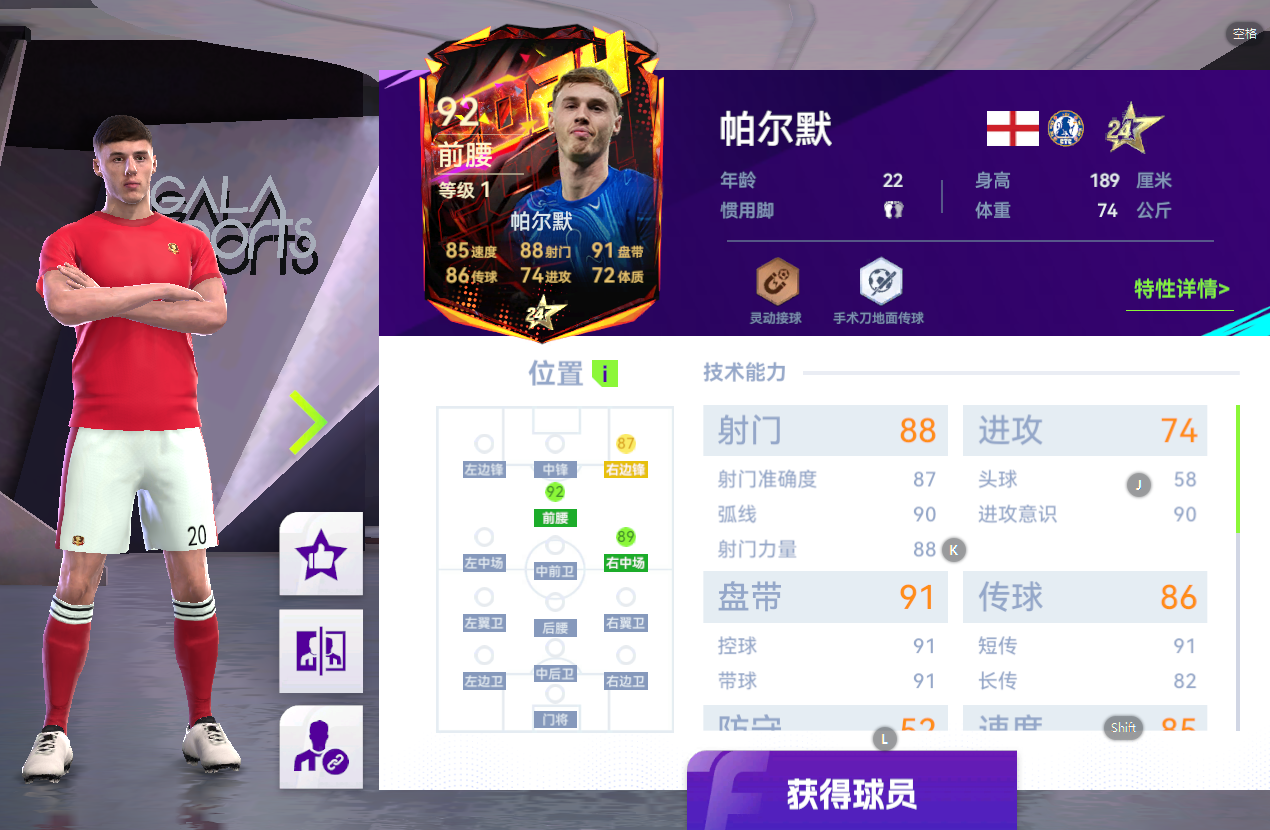 特点跟贝林类似,但是相较于贝林,帕小将更像一个纯组织者,他的特性一个是灵动接球,一个是手术刀地面传球,进攻属性没那么高,防守也几乎等于没有,有的就是超强的盘带,以及精准的短传,包括在门前进行弧线打门的能力也都不错!