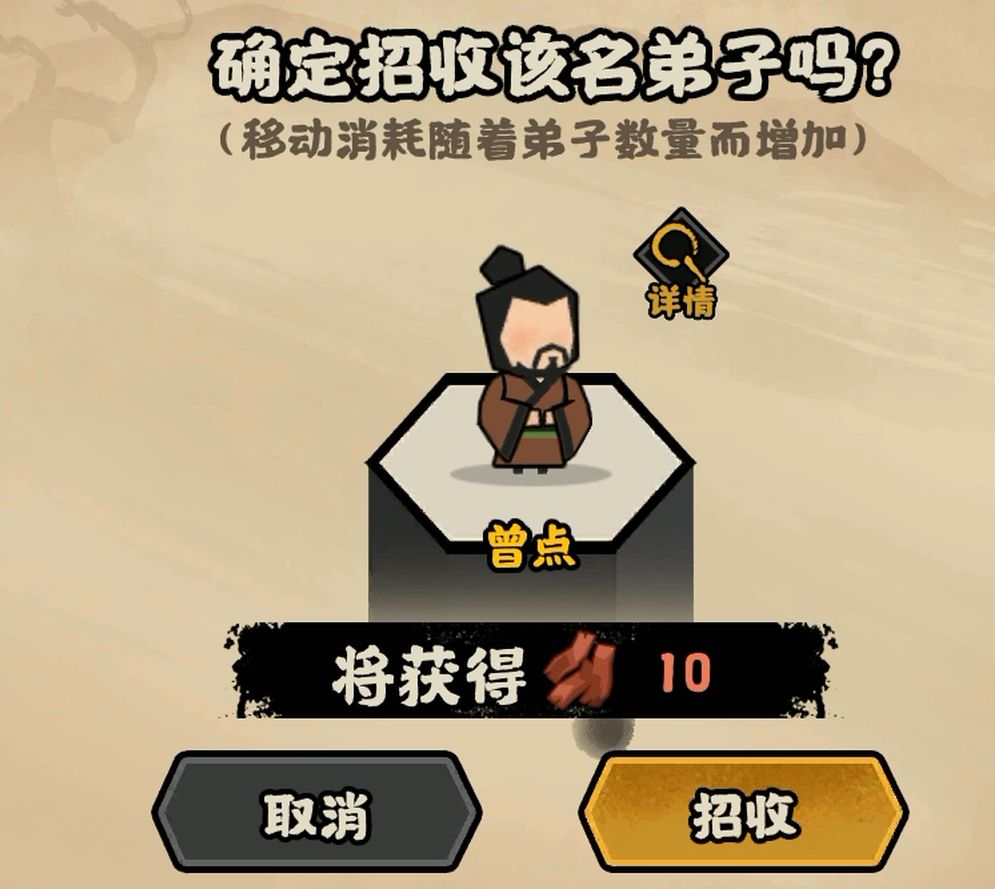 首先我们要把多余的弟子送去出仕,学宫里如果有合适的也可以招募之后送去出仕。如果弟子卡牌太少可以传道一下,招募弟子可以获得10个腊肉,只要传道消耗少于10个腊肉就是赚的,最后只留下颜回这一个弟子。
