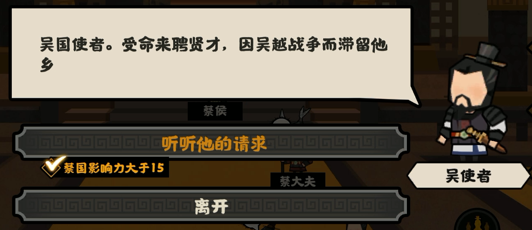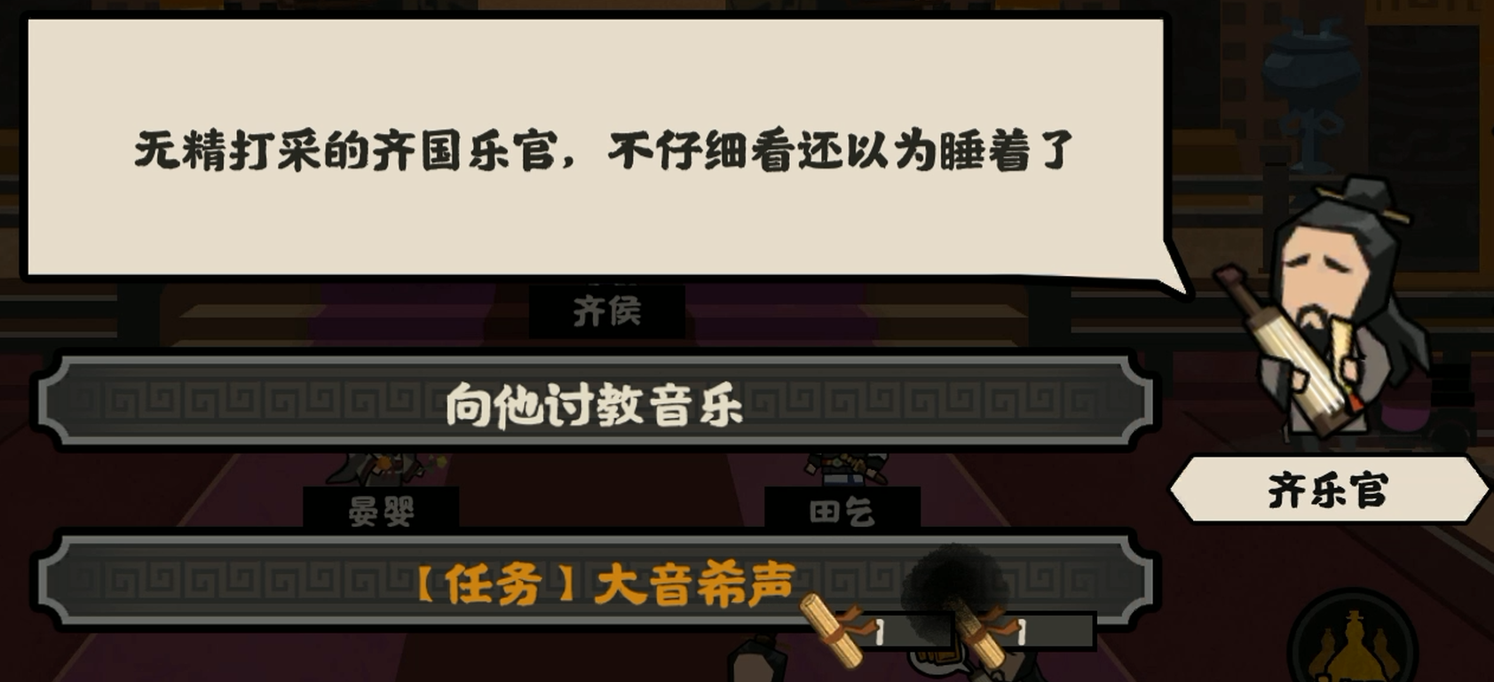 蔡国,先和吴使者对话接取任务,再和蔡侯对话继续任务。然后离开蔡国去往楚国,和楚王对话继续任务,并在之后的战斗中战胜他。顺便和楚乐官对话并战胜他,获得第三个乐文献。然后直奔齐国,注意要自己走,别做马车,出发前记得买够腊肉。这一步是为了最后再刷新一波各国的出仕需求。等到了齐国之后,先战胜齐乐官把第四个乐文献拿到手。