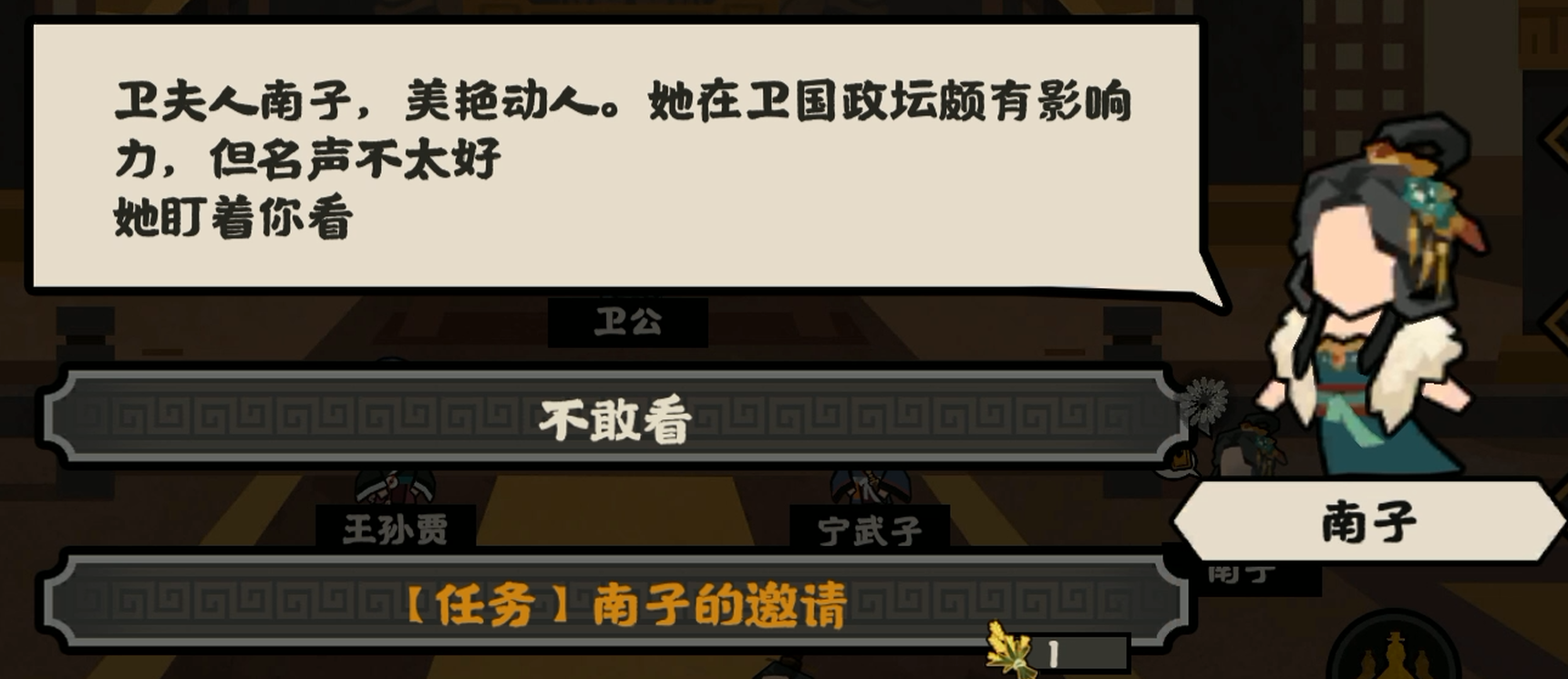 接下来就是孔子和卜商周游列国了,先去卫国找卫公接任务,如果影响力不够就挑战宁武子获取影响力。再和王孙贾对话继续任务,然后离开卫国去到宋国。先和司马黎耕对话,再和宋朝对话并战胜他。顺便和宋乐官对话并战胜他,拿到第一个乐文献。然后回到卫国回复卫公,选择撒谎,再选择见南子,和南子对话并战胜她,至此卫国的任务结束。