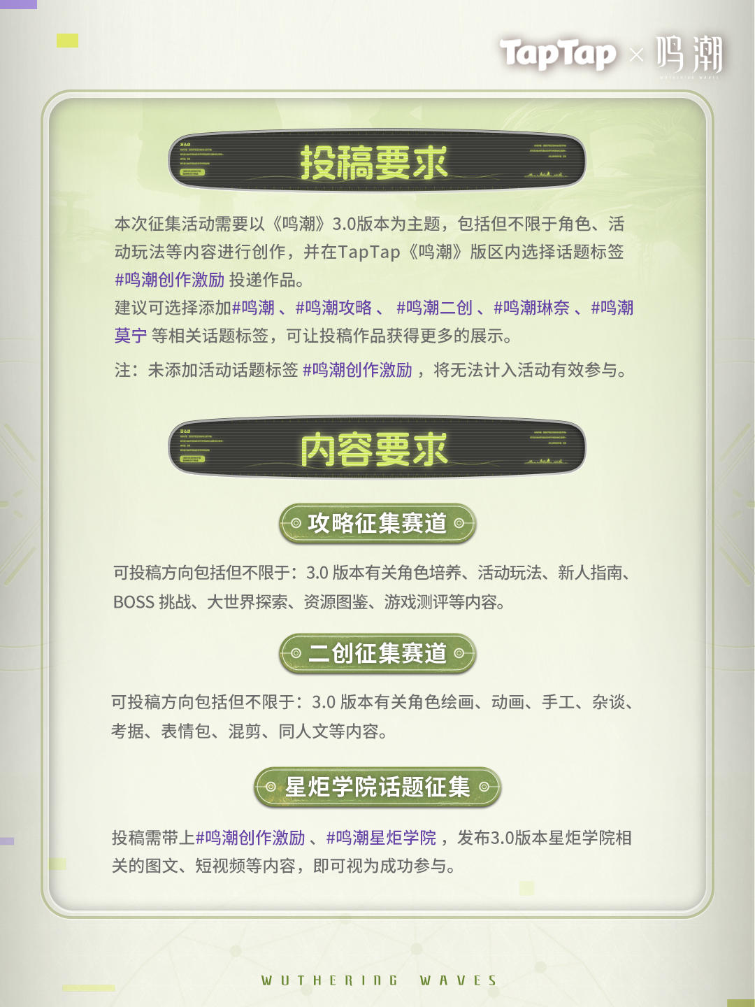 本次征集活动需要以《鸣潮》3.0版本为主题,包括但不限于角色、活动玩法等内容进行创作,并在《鸣潮》版区内选择话题标签#鸣潮创作激励 投递作品。