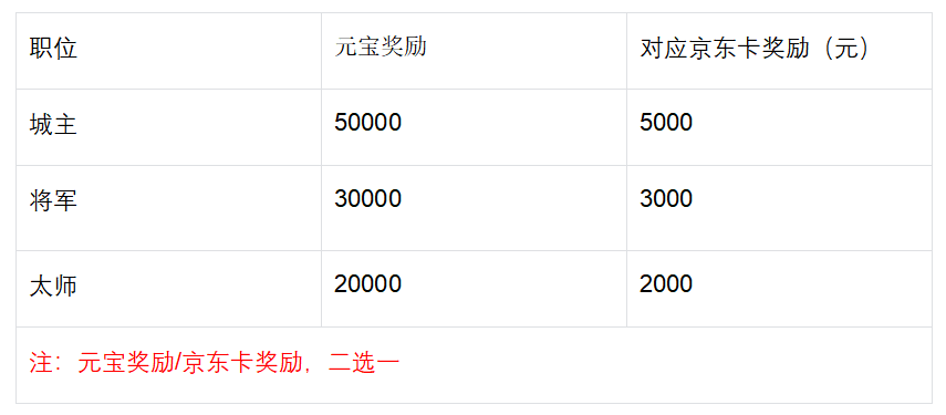 若“职位奖+积分奖+杀敌奖”总额<388888元宝(或京东卡<38888元),剩余金额由首轮城战占领方诸侯联系客服领取,分配给成员。