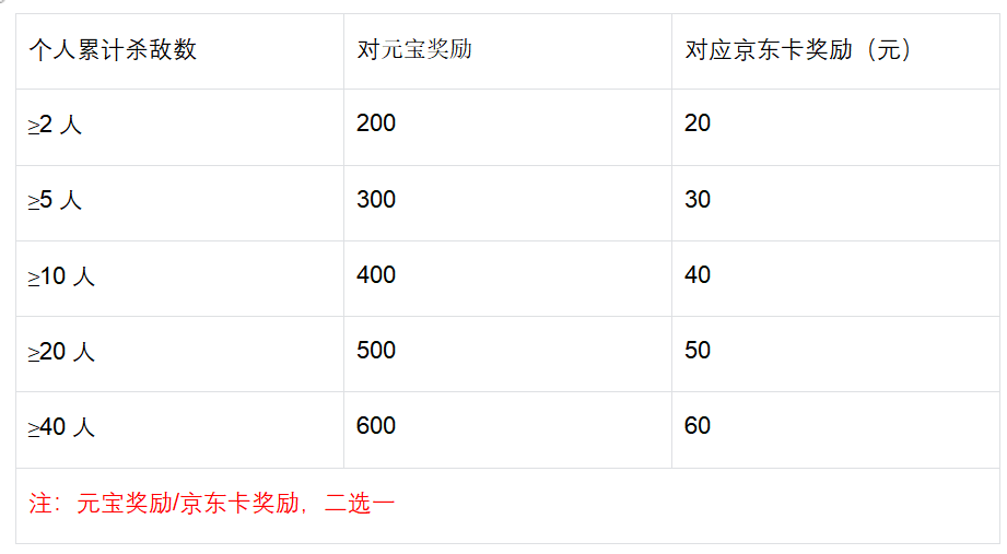 按个人有效杀敌数发放,单人最多得2000元宝(京东卡200元):