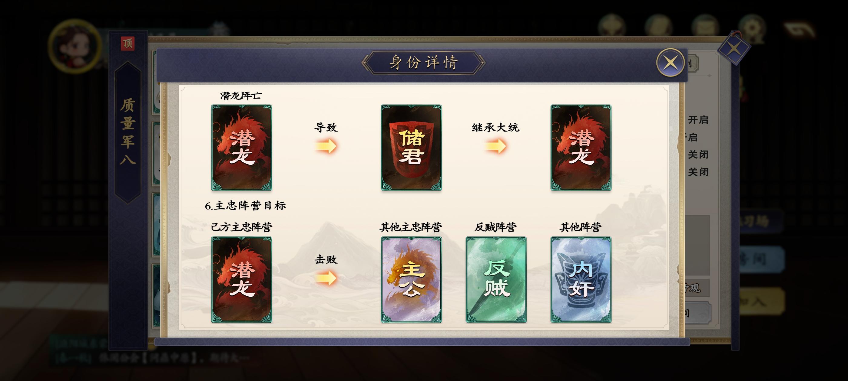 点开左上角牌堆图标,可以看本场身份和身份技能,一场可能有两方主公一方反贼的三方势力对局