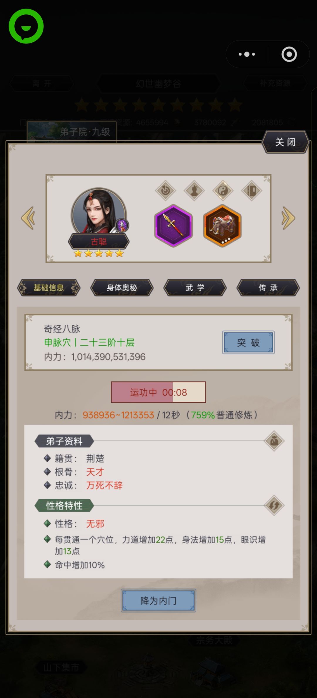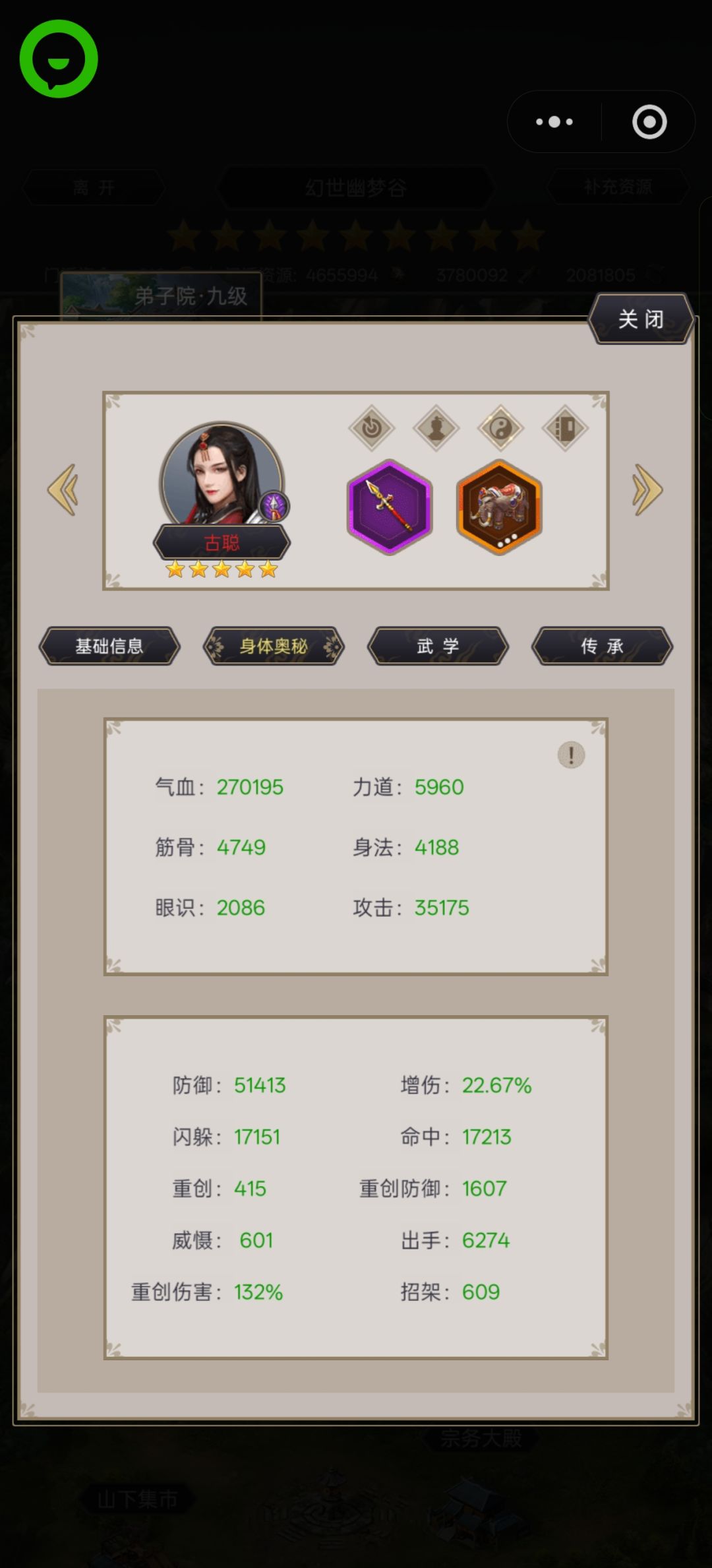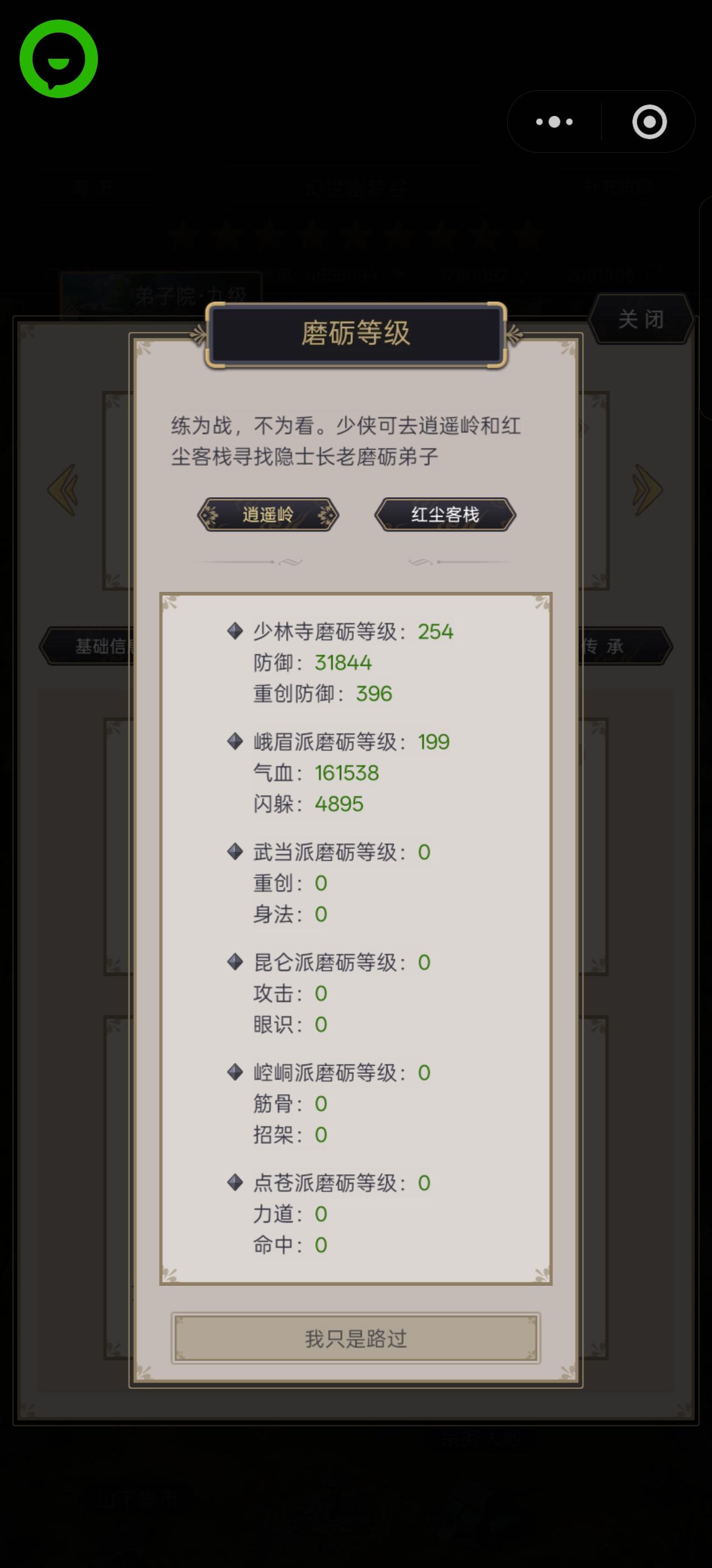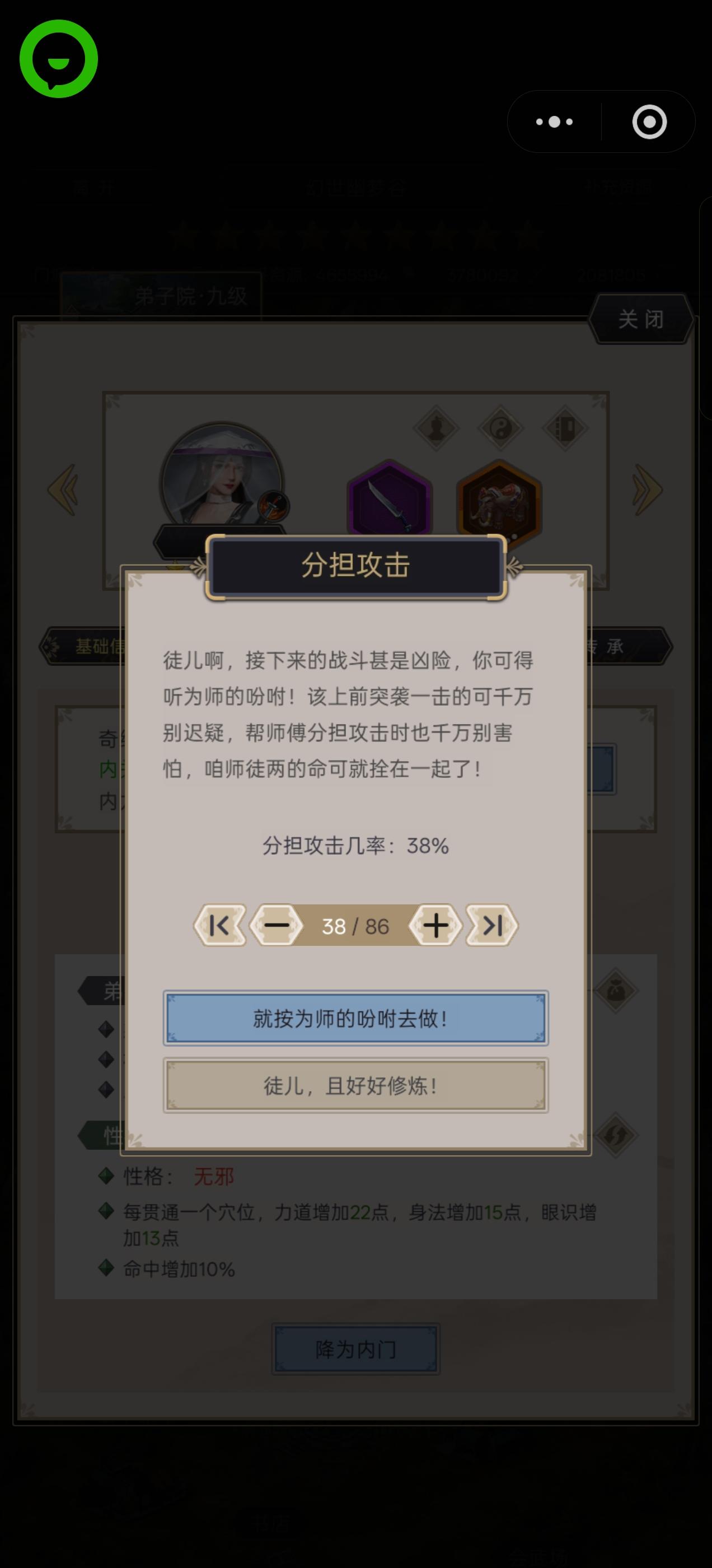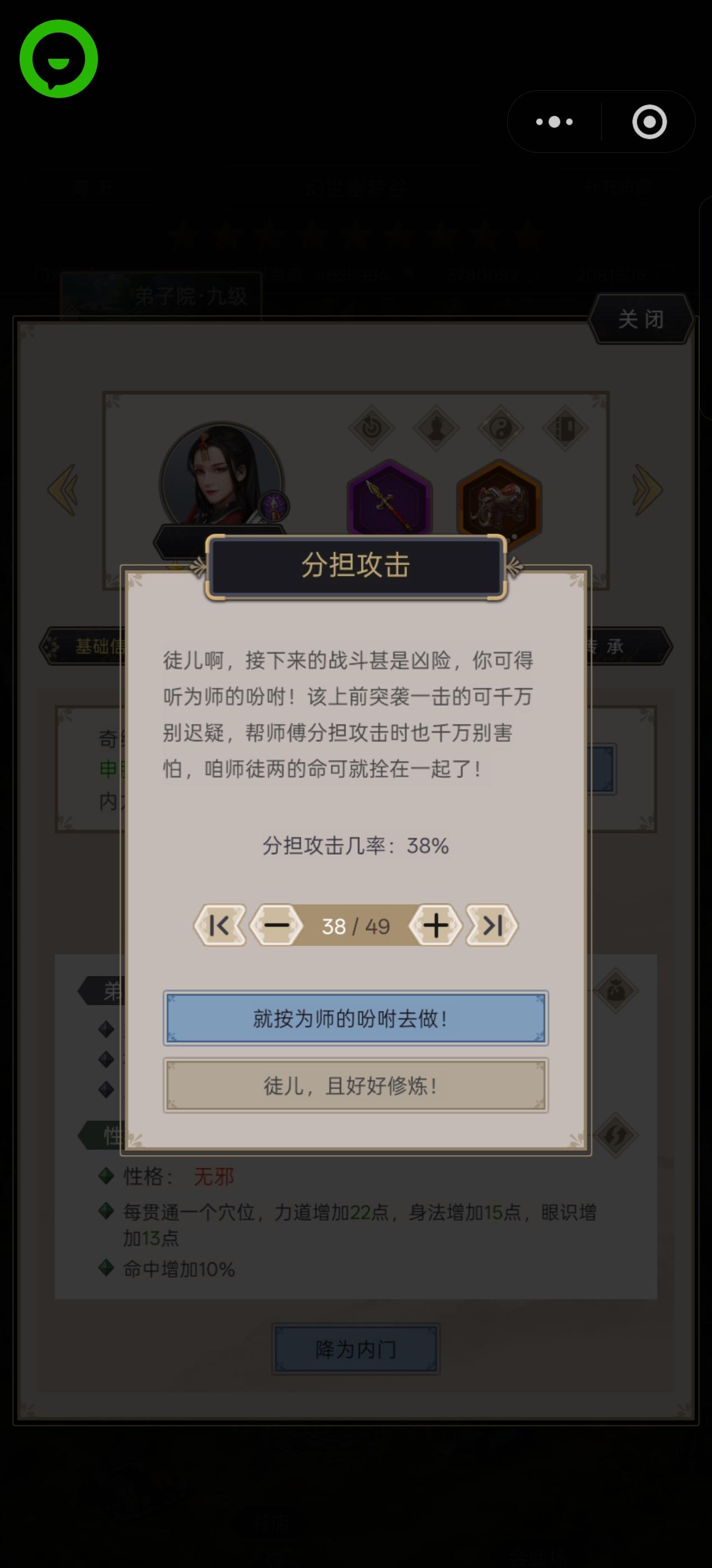 注:弟子挡刀率在37~38%是比较适合的范围,基本是挨一到两下打,能比较容易出半血传承,枪半血传承必中,可以不用磨砺命中,也不用命中天赋,只要扛得住就行,因为弟子武器寒冰有概率亏反击,我把前三回合的弟子武器都给下了,不过这东西就是看运气