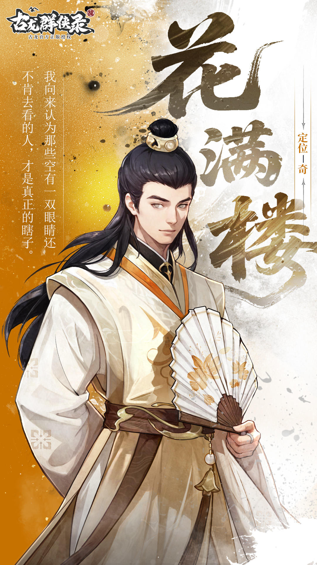 古龙武侠小说《陆小凤传奇》中的重要人物,江南花家第七子。自幼双目失明,性情温和宽容,擅长流云飞袖与闻声辨位武功,与陆小凤结为生死之交。作为和平主义者,花满楼虽遭初恋上官飞燕欺骗仍保持宽恕态度,始终相信世界充满爱与温情
