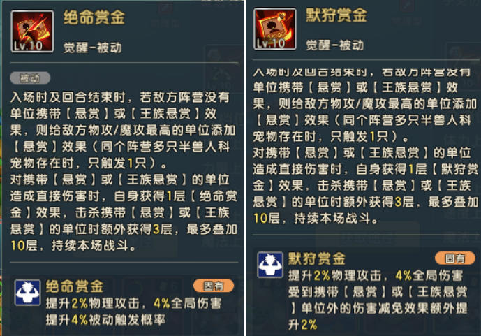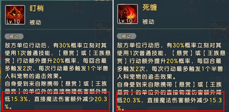 技能特点:敌方行动,会30%概率(悬赏单位行动额外+20%)带动半兽人进行普通技能攻击(但是仍是绑定悬赏单位进行攻击);并且除了标记悬赏的单位,对其他单位都有减伤效果,两个技能差异就是物理减伤和魔法减伤的区别;