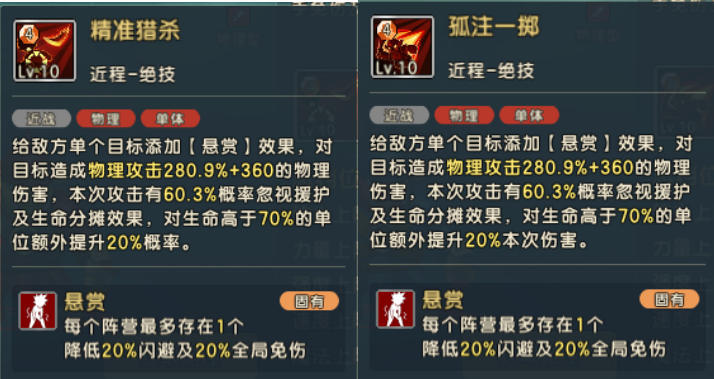 【悬赏】为固有技能,降低对方20%闪避和20%全局免伤;