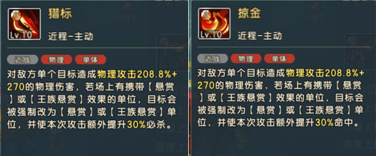 技能特点:强行绑定攻击悬赏(入场和每回合末都会添加)标记单位;两个技能差异,一个是增加30%必杀,一个增加30%命中;