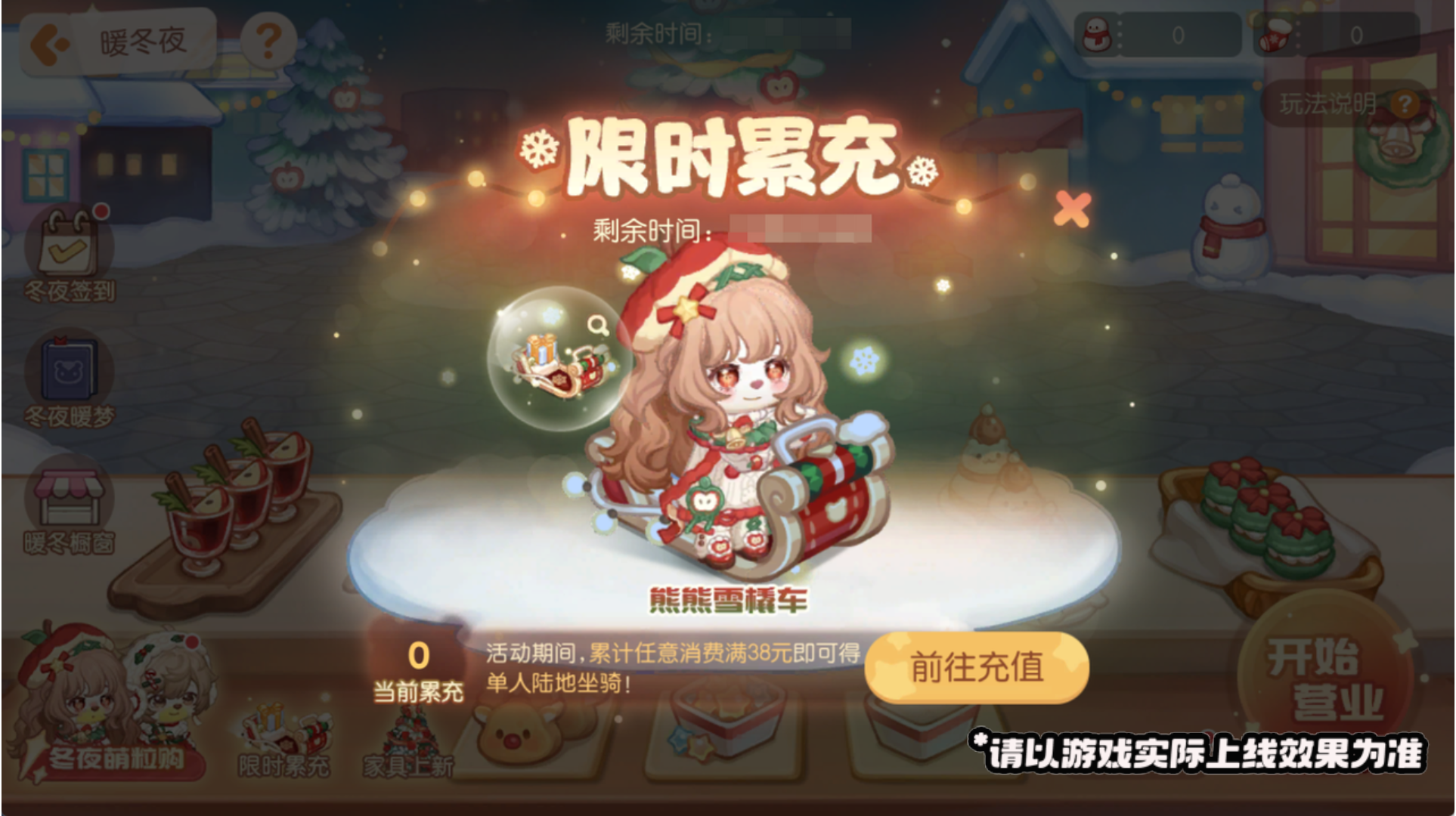 活动介绍:限时累充活动限时开启,在活动期间,在游戏内进行任意充值可累积充值额度。当累积充值额度达到对应的档位额度时,可点击领取对应奖励:陆地坐骑「熊熊雪橇车」,快来参与吧!