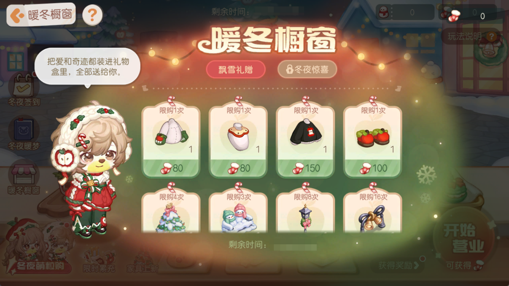 1、小奥比们可通过完成每日任务获取「暖冬徽章」。选择营业时间段,达成对应的经营目标后,即可使用「暖冬徽章」换取「冬夜礼物袜」。不同营业时间经营难度不同,可换取的「冬夜礼物袜」数量亦不相同。