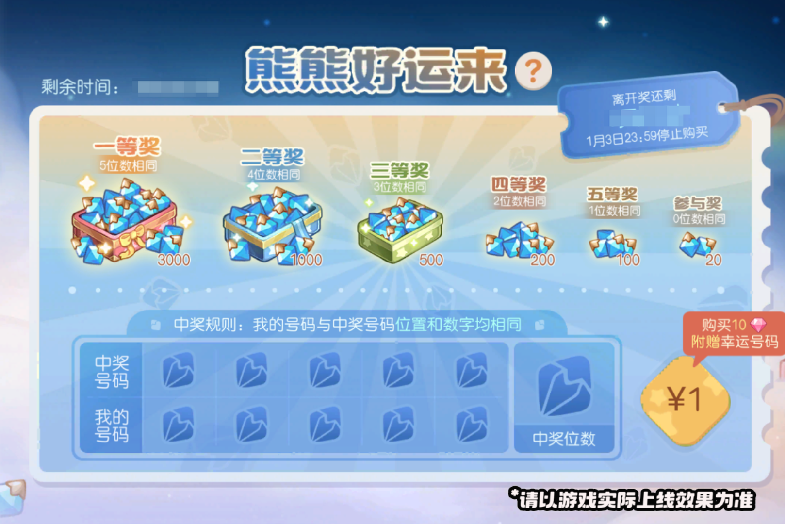 活动介绍:活动「熊熊好运来」限时开启!花费1元购买10粉钻即可获赠一串5位数的幸运号码,“我的号码”与“中奖号码”的位置和数字都相同,则中奖,中奖位数越多奖励越高!
