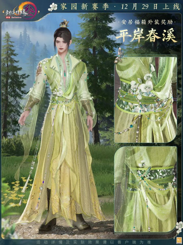 新赛季将于12月29日上线,悠然生活全新启幕。安居福箱奖励更新,全新外装奖励“平岸春溪”隐芳含幽,衣间藏翠盈春色满怀,绿意染袂似新叶拂风蜻蜓翩翩,停驻满目暖晴。