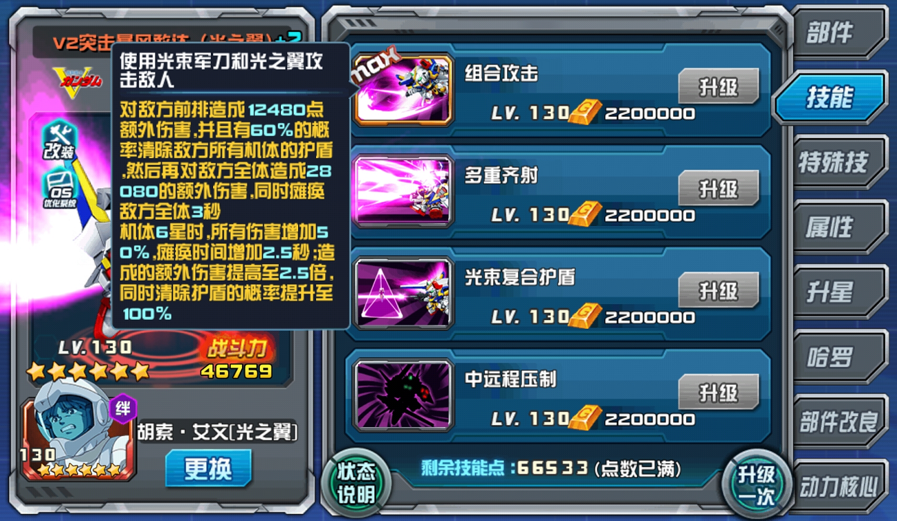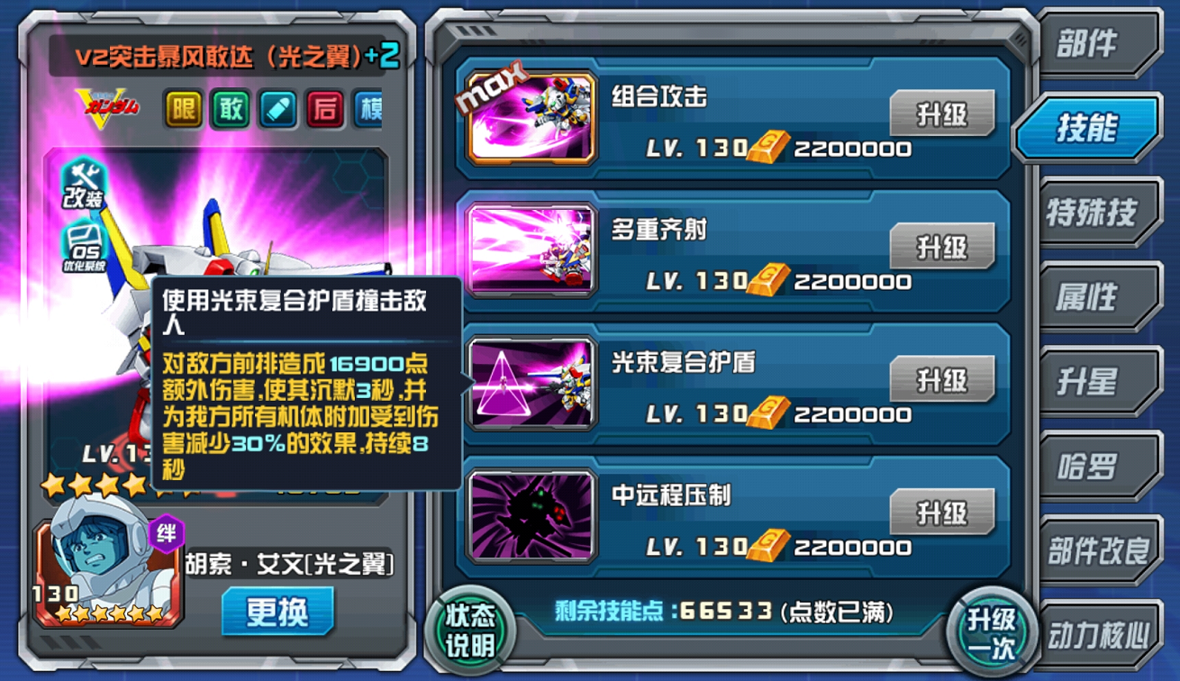 机体6星时,所有伤害增加50%,瘫惋时间增加2.5秒;造成的额外伤害提高至2.5倍,同时清除护盾的概率提升至100%
