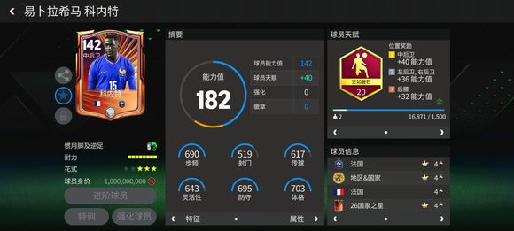 球员天赋:坚如磐石(冲刺速度、长传、人盯人、拦截、侵略性)