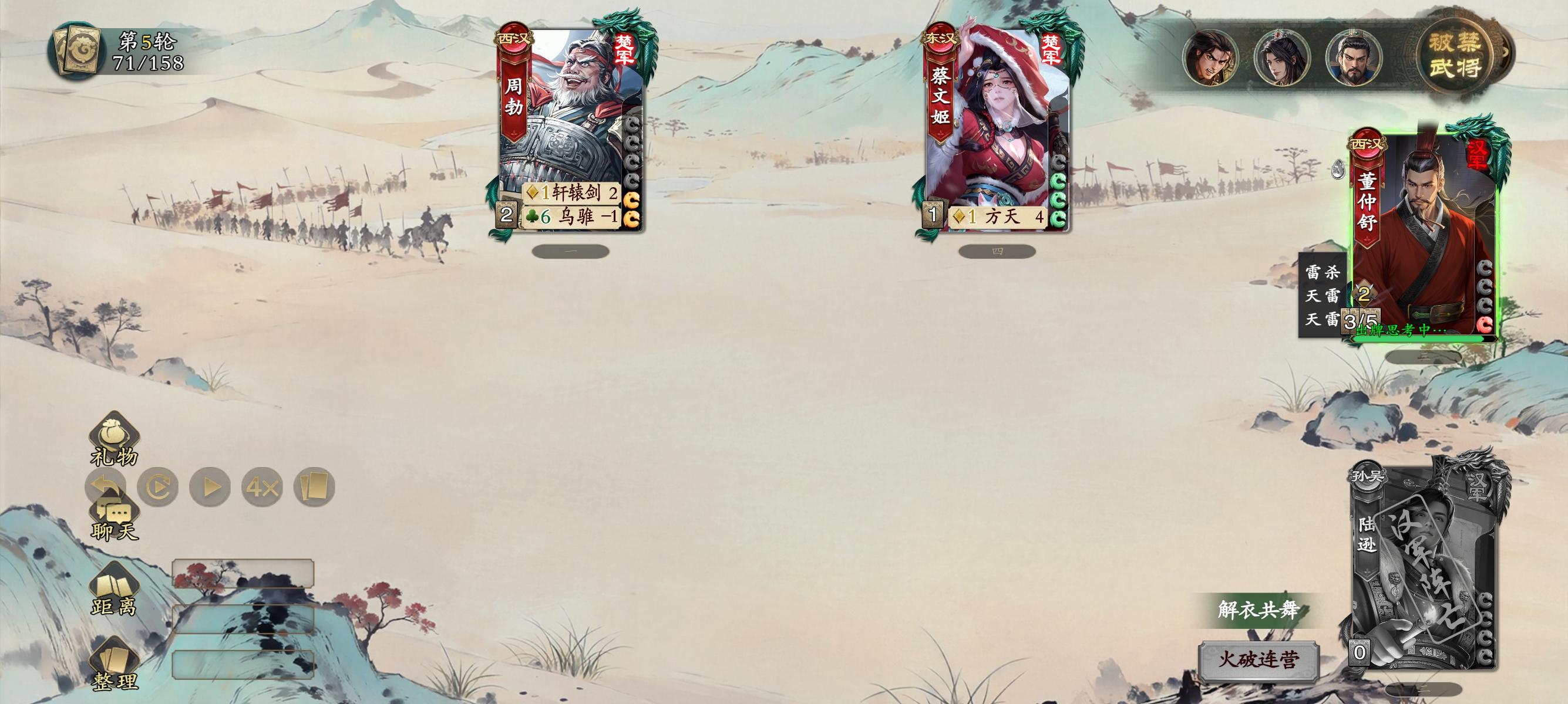 1.罢黜百家 (启动技能)第一印象是摸五中,摸顺,南门万剑,但是董本质上是个摸3将,很难有这么多锦囊,我和一位兄弟排位时候,他提醒我印闪电。闪电可以多次滚动,频繁触发董的技能摸牌,压制。地火溅射不考虑。同时还能把对面锦囊无效化。