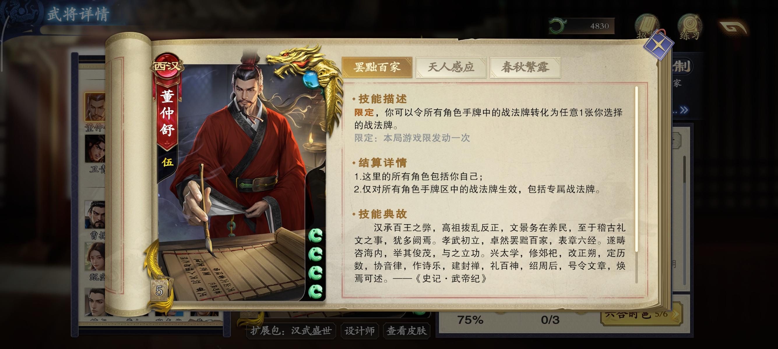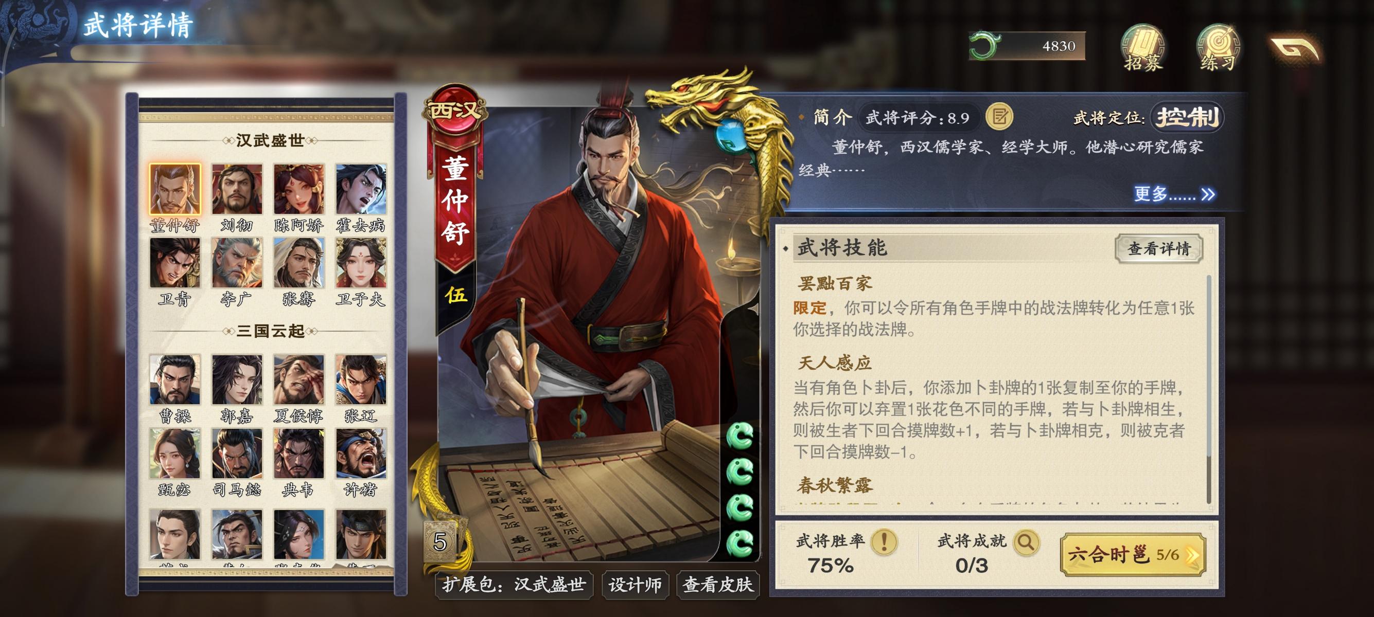 最近22拿到卫青,就没怎么打了。转战癫疯赛,巅峰赛因为ban将,经常是残运会大比拼,这时候我发现董仲舒在残运会中有这不错的发挥(别让ai用,我至今没有一次成功支配过ai)