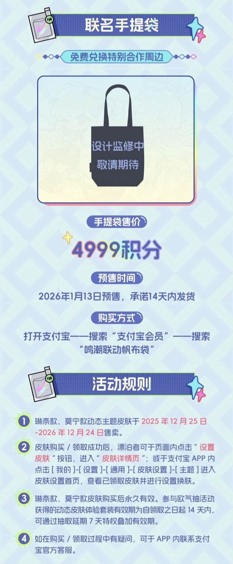本次合作同步推出实体周边产品。支付宝定制了专属联名手提袋,用户可通过积分免费兑换。该周边预售将于2026年1月13日启动,兑换价格为4999支付宝积分。此举将虚拟IP与实体商品结合,拓展了联动边界。相较于第一期仅包含四类数字皮肤,二期新增的出行皮肤进一步丰富了应用场景。