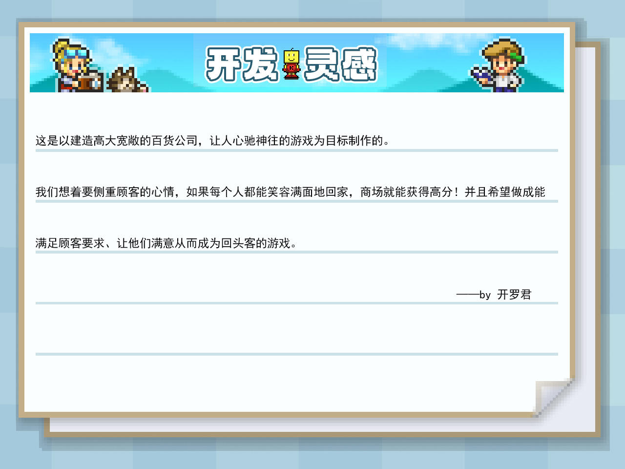 在游戏里,你将开一家百货商场,你可以在你的商场里布置各式各样的店铺,也可以加装设施让游客更安心的逛遍整个商场,相性优秀的店铺做邻居可以获得更多青睐哦~快来布置最壮观的百货商场吧!