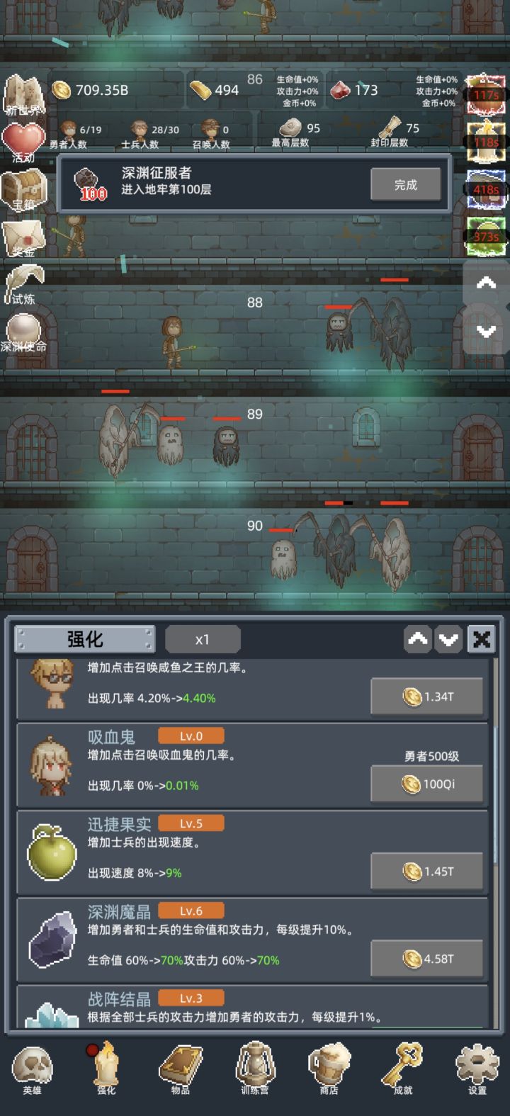 大概知道了 金砖用来升商店的啤酒 然后刚开始玩主要是升勇者 还有魔晶和结晶 你点了魔晶和结晶以后会发现冲关速度很快了