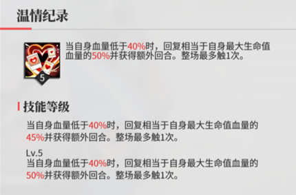 自身血量低于 40% 时,回复相当于自身最大生命值 50% 的血量,且获得 1 次额外行动回合(游戏中额外行动极为珍贵,按每回合 1 次行动的常规机制推算,在对局平均 3 回合结束战斗中,触发可直接提升约 30% 总输出量,相当于多一次额外技能联动,制造瞬间爆发输出),整场最多触发一次,是提升容错与爆发上限的关键。很不错的誓约技能,有条件都建议开启。
