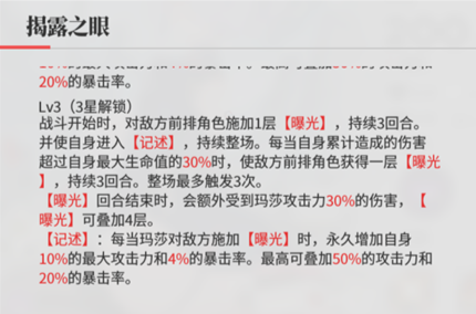 额外 【曝光】 叠层机制:每当自身累计造成的伤害超过自身最大生命值的 30% 时,使敌方前排角色获得 1 层【曝光】(持续 3 回合),整场最多触发 3 次。