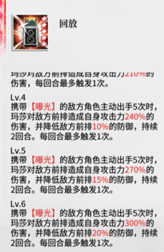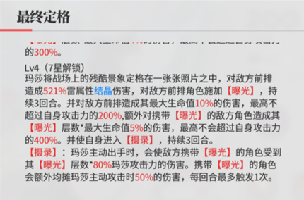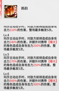 【摄录】:主动出手时,使敌方携带【曝光】的角色受到【曝光】层数 ×80% 攻击力的伤害(最高320%),且携带【曝光】的角色会额外均摊玛莎主动伤害的50%(即前排3个单位都将受到玛莎的17%伤害),每回合最多触发 1 次。