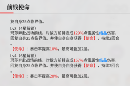 对敌方前排造成 157% 雷属性结晶伤害,并使自身获得持续2回合的【使命】(暴击率提高 20%,最高可叠加 2 层),很不错的增益buff,可全场覆盖。