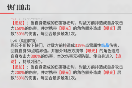 【追访】:当自身造成的伤害暴击时,对敌方前排造成自身攻击力 200% 的伤害,并对携带【曝光】的角色额外造成【曝光】层数×50% 攻击力的伤害(满层200%),每回合最多触发 1 次。