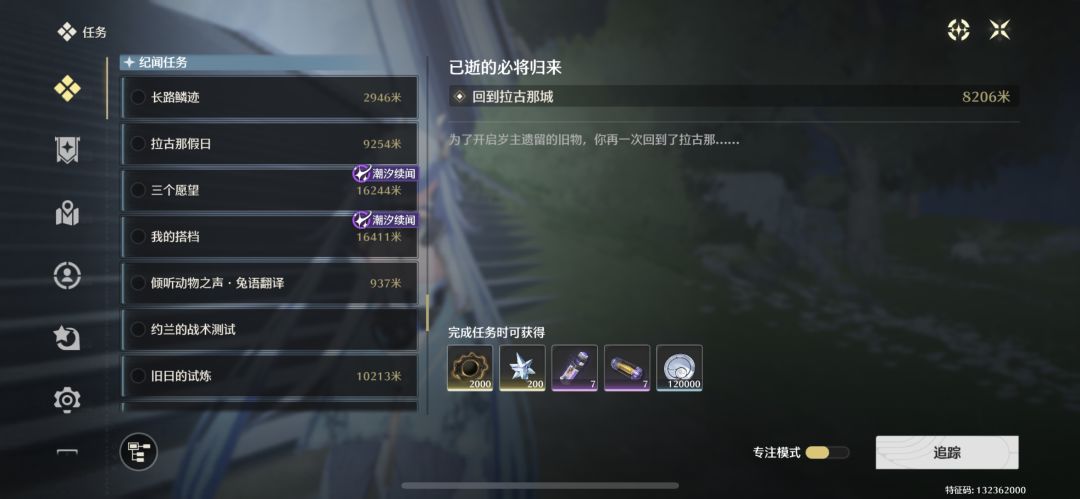 特意在地图标了点怕以后忘记在哪拿的了),然后宝箱只拿了主线路上撞脸的,其他的一个都没有刻意去找。关于地图上的那些蓝色问号的纪闻任务,我都是看见了先接,有空就一次性做完。今州的主线已经做完了,途中累积了十几个纪闻任务,事后一次性做完了,目前在黎娜西亚又累积了二十多个,还没做完,因为主线还没跑完。关于人物方面,