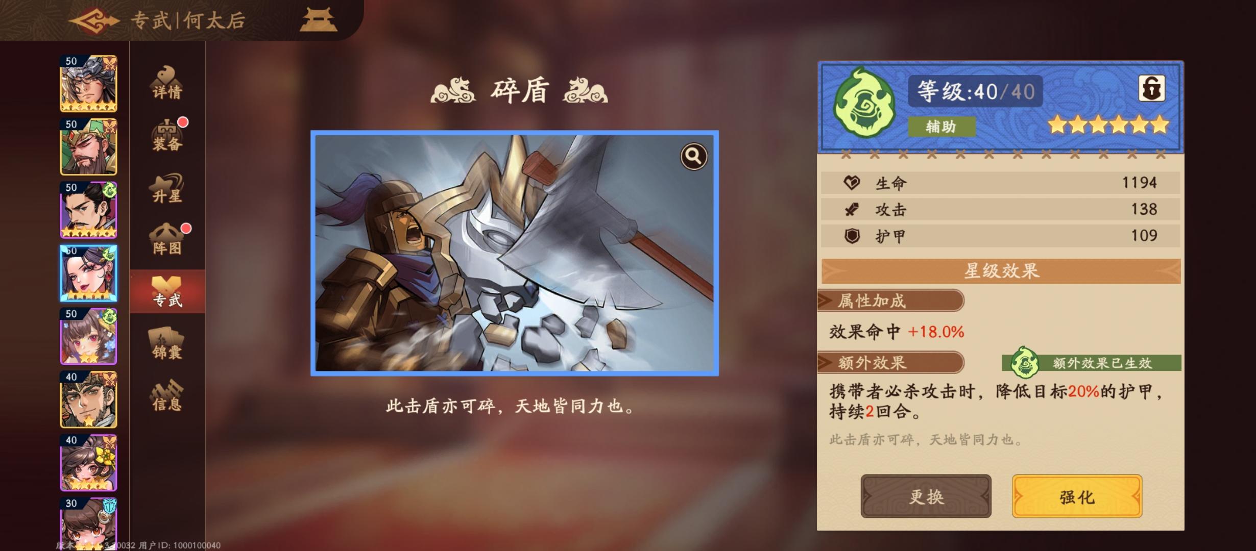 何太后(紫卡,命座越高越好) 推荐锦囊:乐不思蜀,前期依旧可以速度散件 专武可使用碎盾