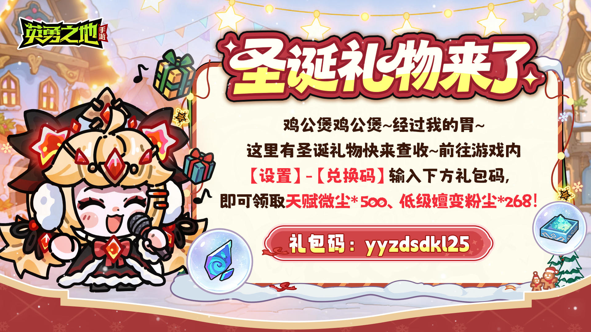 鸡公煲鸡公煲~经过我的胃~前往游戏内【设置】-【兑换码】输入下方礼包码,即可领取天赋微尘*500、低级嬗变粉尘*268!
