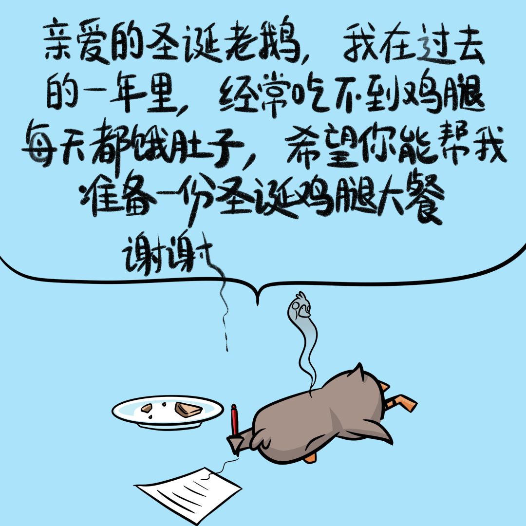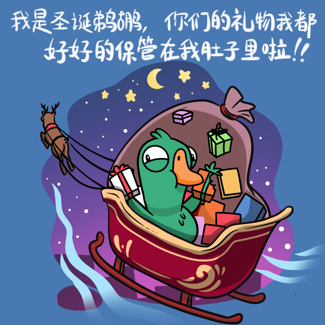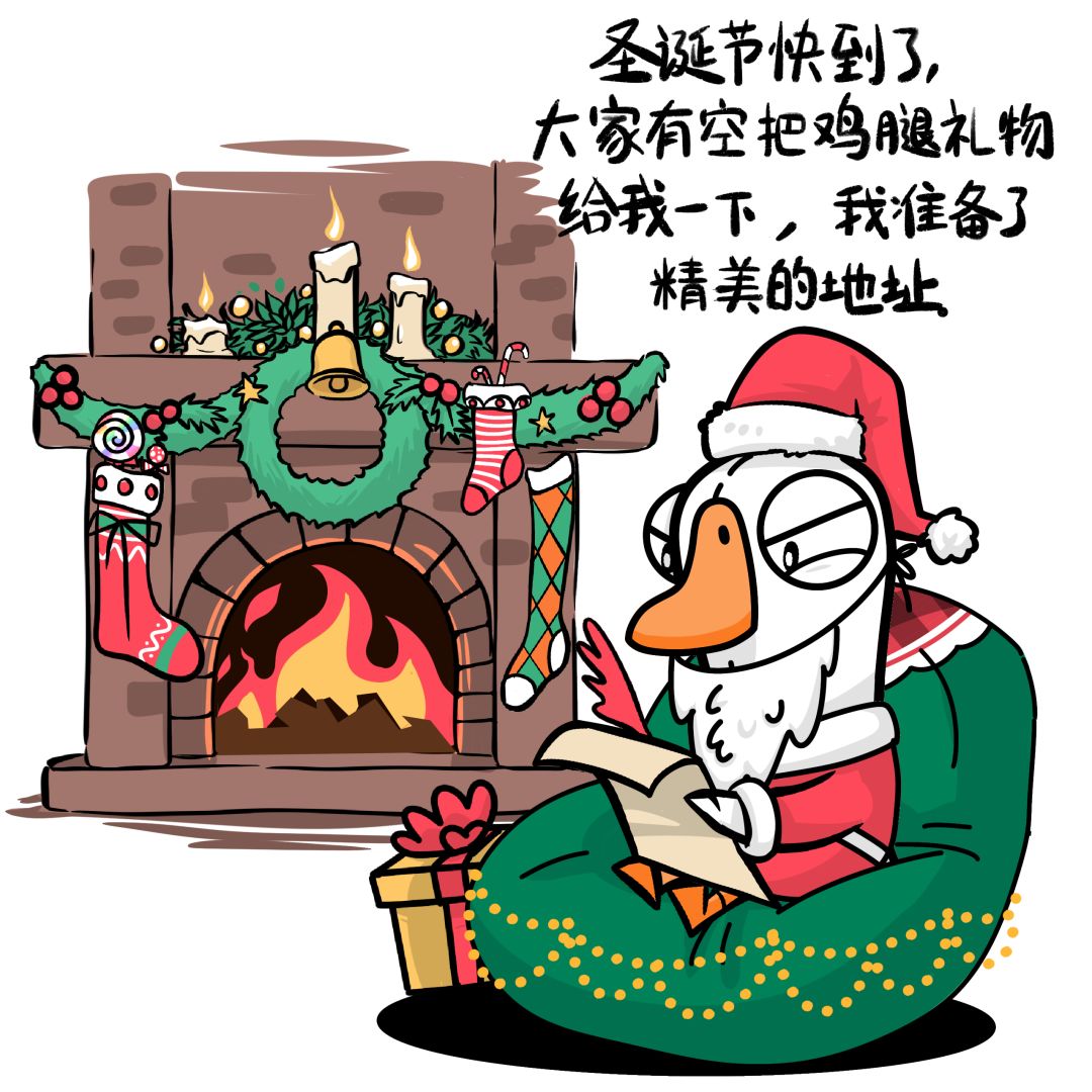 亲爱的圣诞老鹅,我是个幸运的鸭,我在过去的几年里,几乎每年都得到了你送的鸡腿,你总是费尽心思地给我准备惊喜。