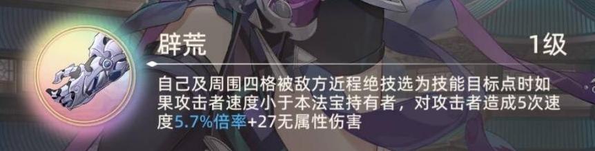 法宝技能(等级1):自己及周围四格被敌方近程绝技选为技能目标点时如果攻击者速度小于本法宝持有者,对攻击者造成5次速度5.7%倍率+27无属性伤害。