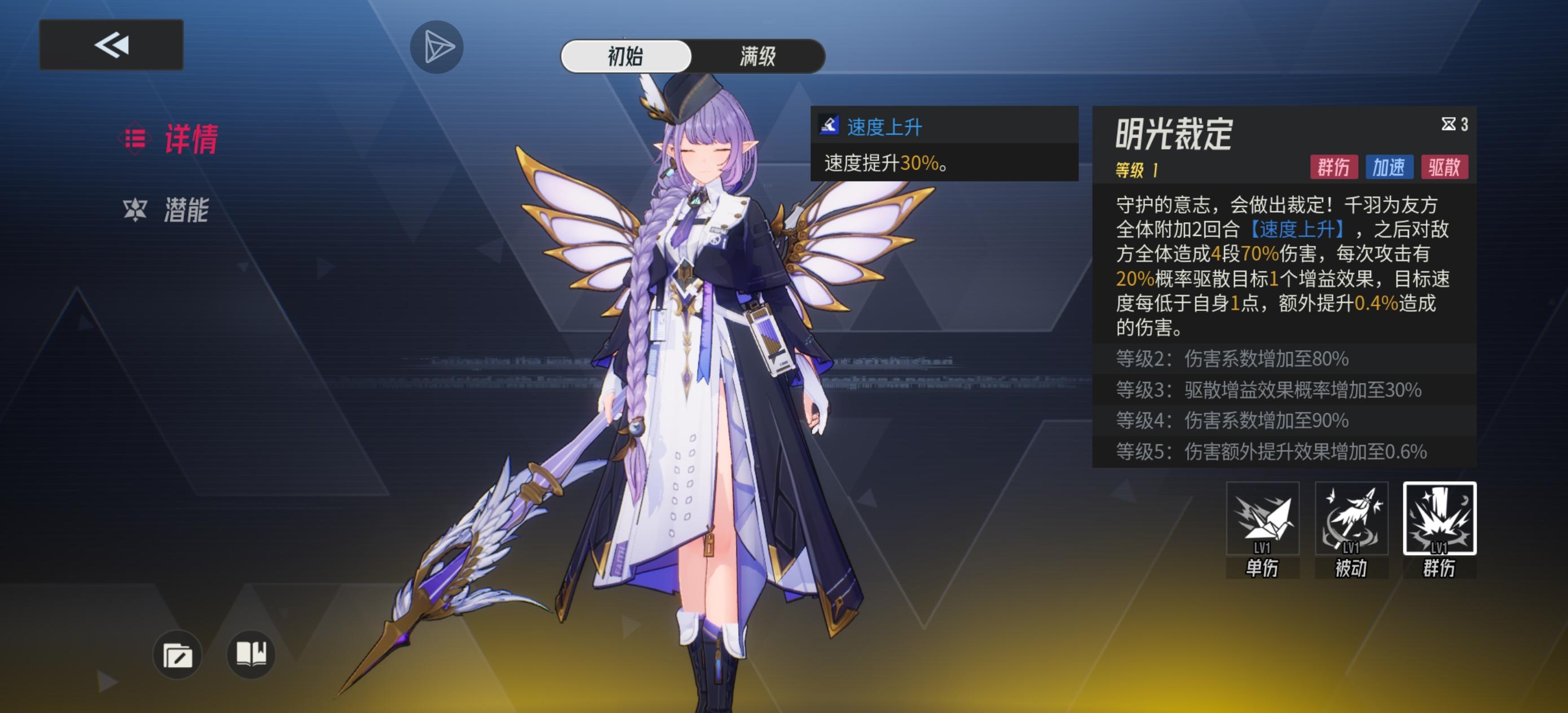 技能等级战神,大招多段驱散,二技能点满,常驻免疫。一技能还带有拉条效果。本体后期常驻多60点速度,也就是常驻24%增伤。满级大招36%增伤,可以配合速度类角色,如水系阿凛,另外也可以配合降速角色:荼蘼等,提前或着多吃到不俗的增伤, 被动会选择性释放,不一定会给全体上buff,Pv p要么叠满二技能当免疫兼驱散插件,要么就是叠满大招当c,当然最好就是两个都点满,到哪都能走一走