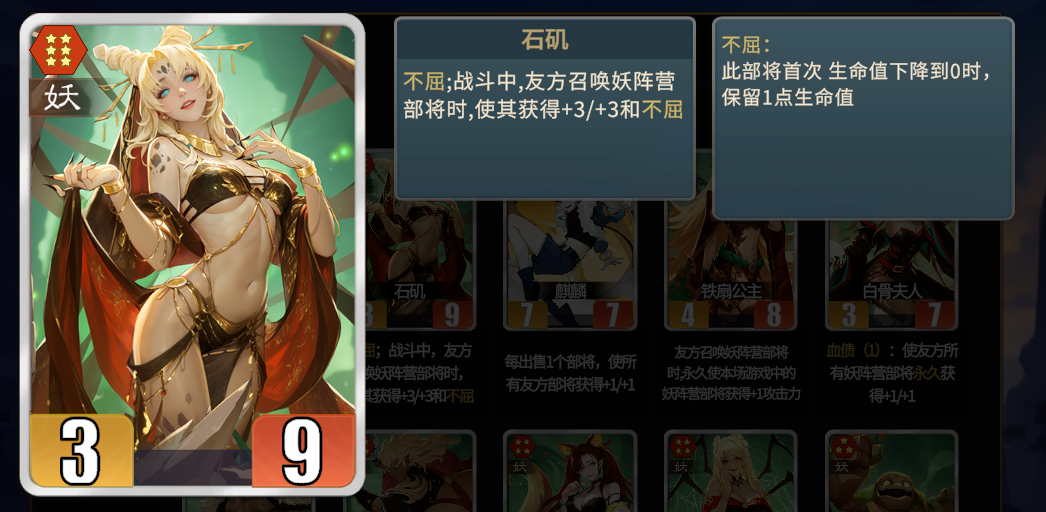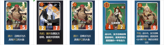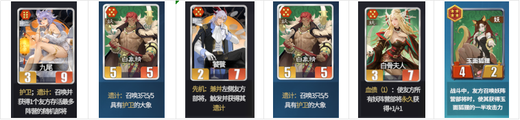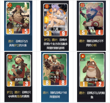 牛魔王:召唤随机2个妖族牌。不包含自身共计17张妖族牌,其中白板有9张,毒药1张,不屈3张,护卫2张,带遗计召唤物的牌4张,一半的概率出白板,比较坑爹,有的选就不带。