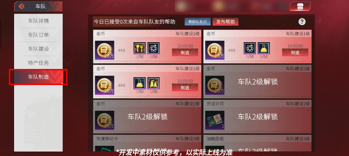 使用从特产任务中获取的原料并按配方合成,便可产出金币、货运许可、图纸等各类资源和道具。制作需耗费一定时间,可发起求助邀请车队队友协助加速。