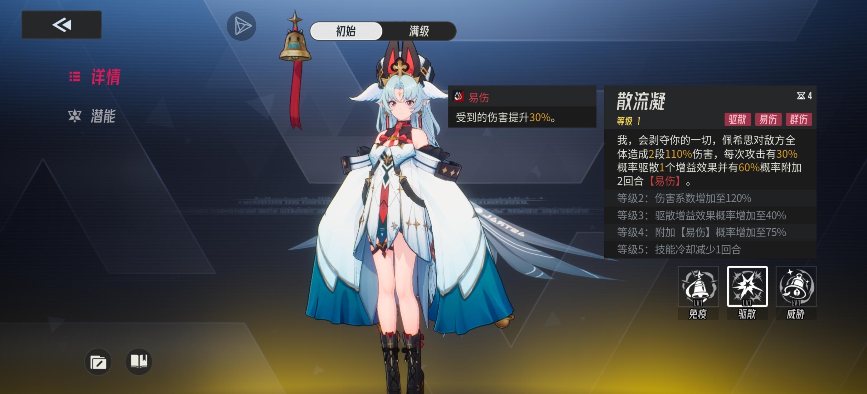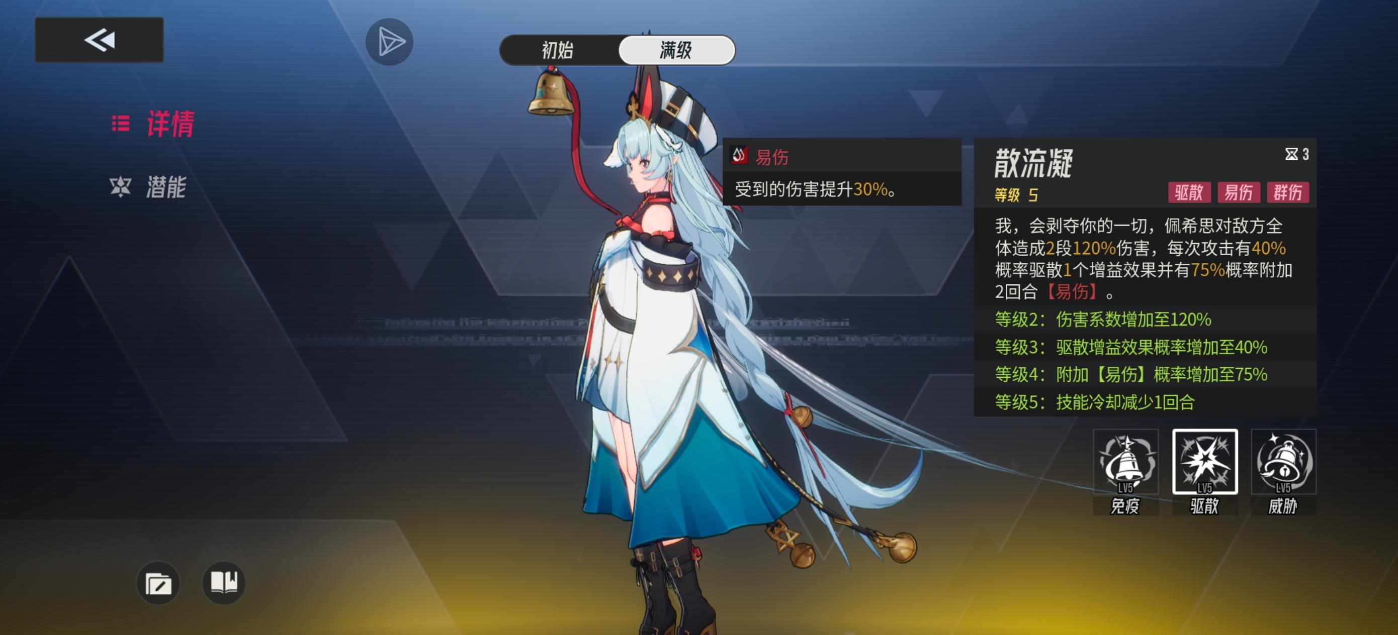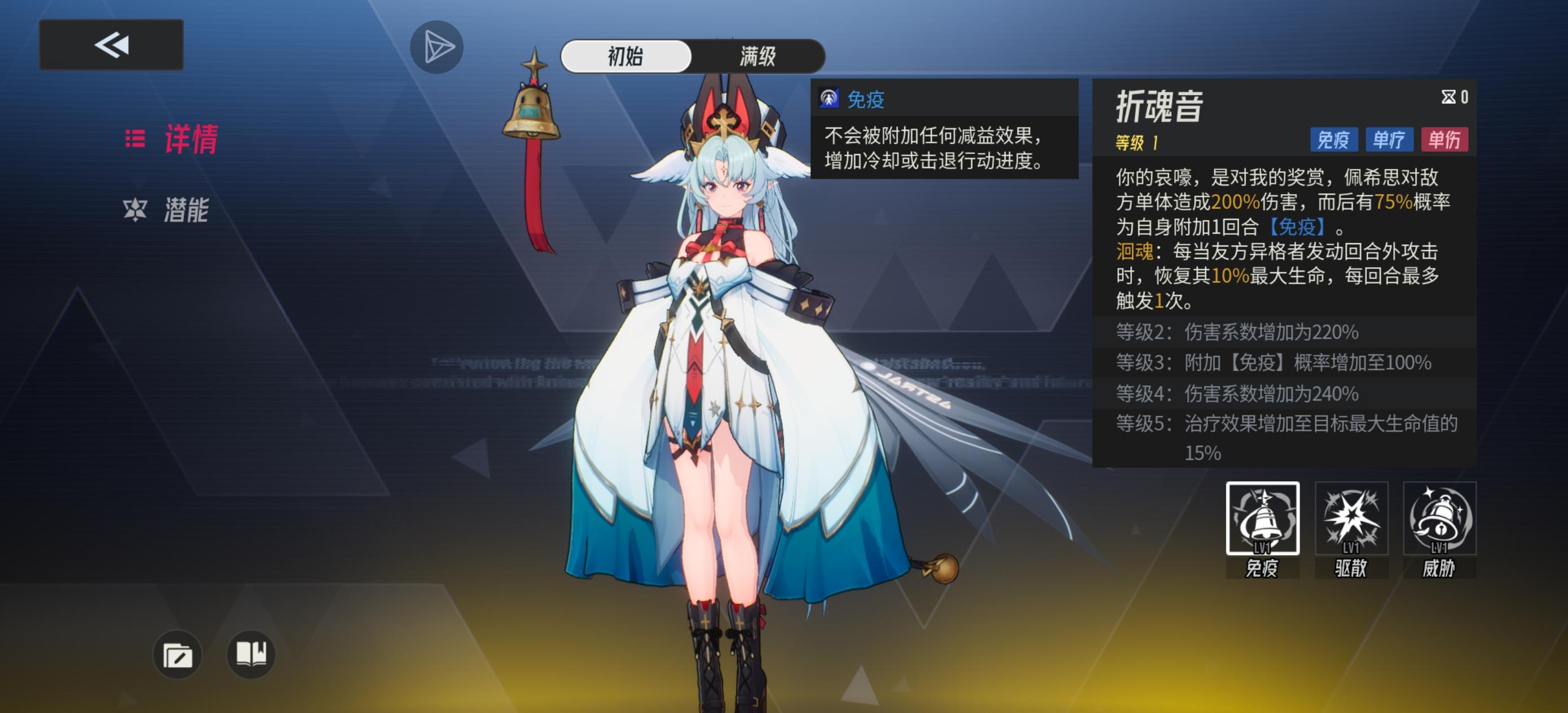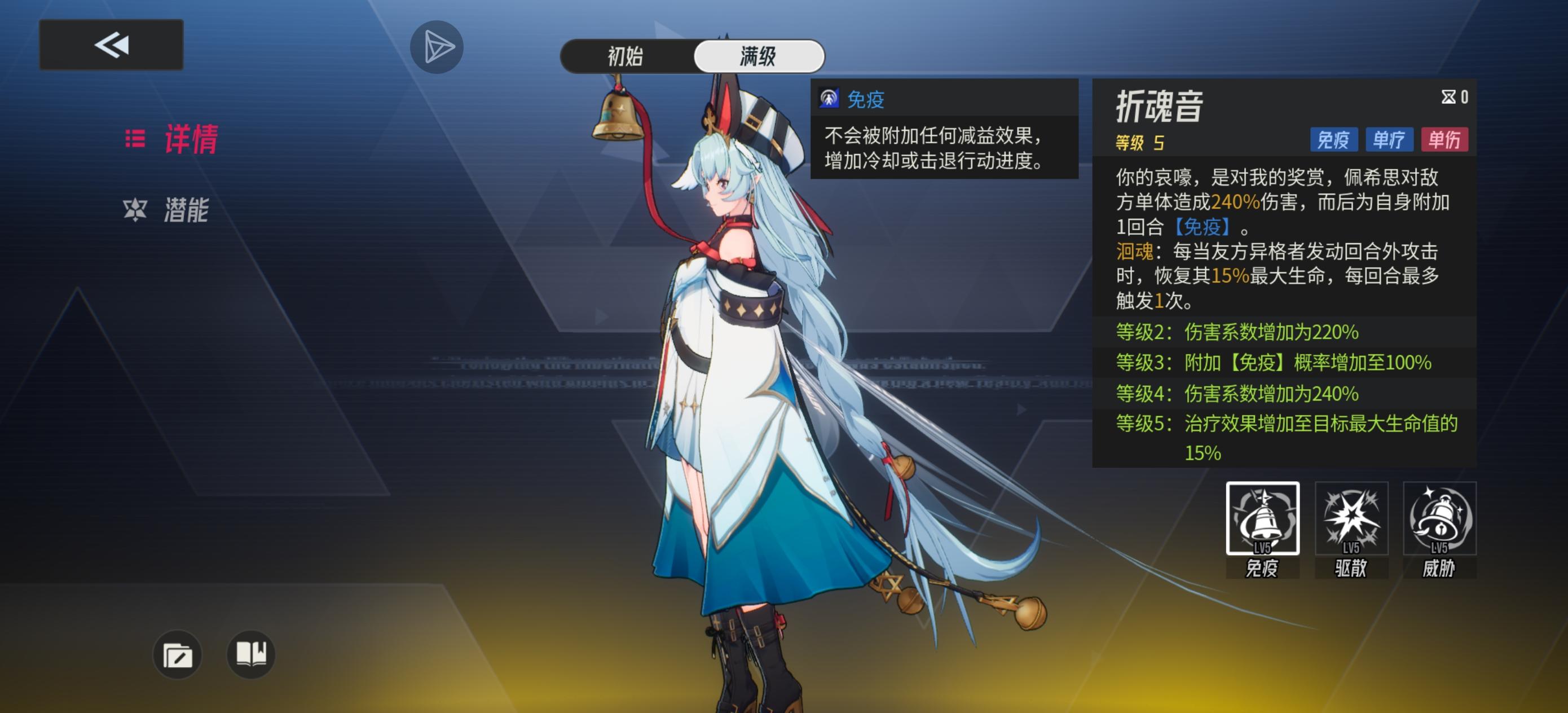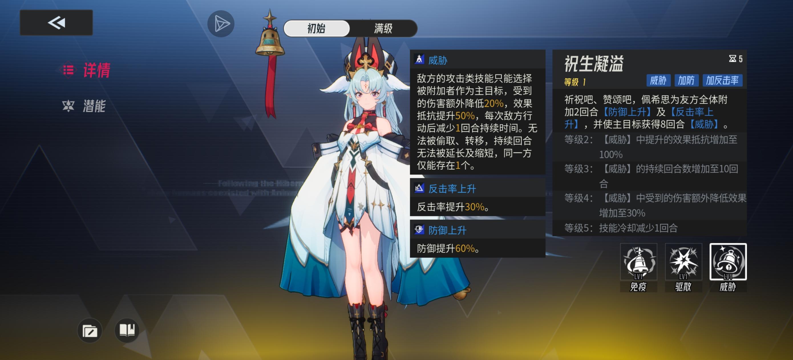 大招高达八回合威胁,20%减伤,满级大招30%减伤。二技能驱散并附加易伤。一技能点满,常驻免疫。本体也有不错的高概率,可以配合防御带荆棘的角色,这样防御角色也可以在活动本有不错的出场率,相当于水系版另类的罗魍, Pvp由于可以被驱散,所以要注意ba位或者队伍的搭配