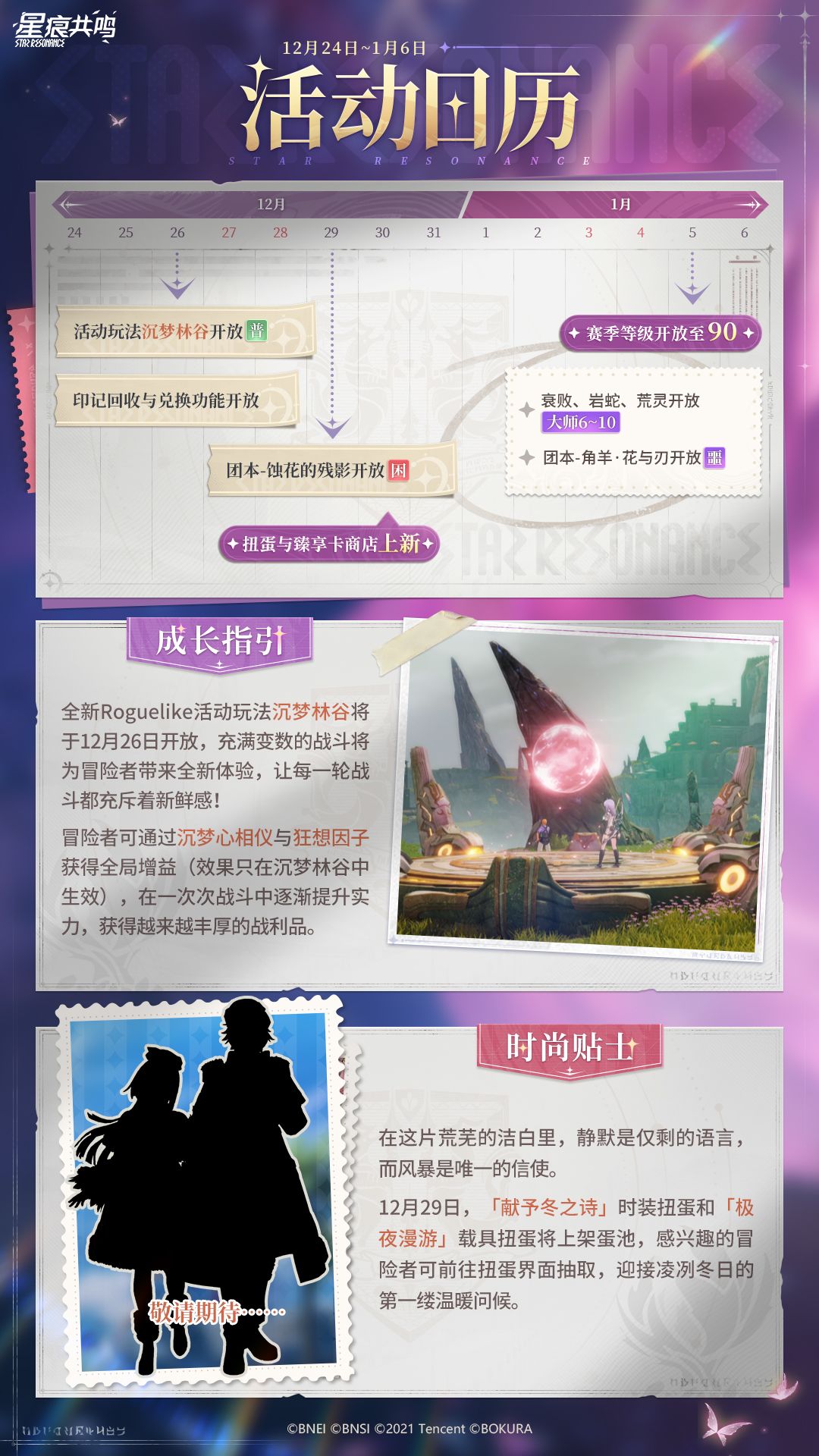 冒险者期待已久的肉鸽玩法「沉梦林谷」即将在12月26日开放,参与活动体验丰富自由的挑战,将多种养成道具与个性化外观收入囊中吧;12月29日,「献予冬之诗」时装扭蛋和「极夜漫游」载具扭蛋将开放获取,感兴趣的冒险者敬请关注后续官方爆料。