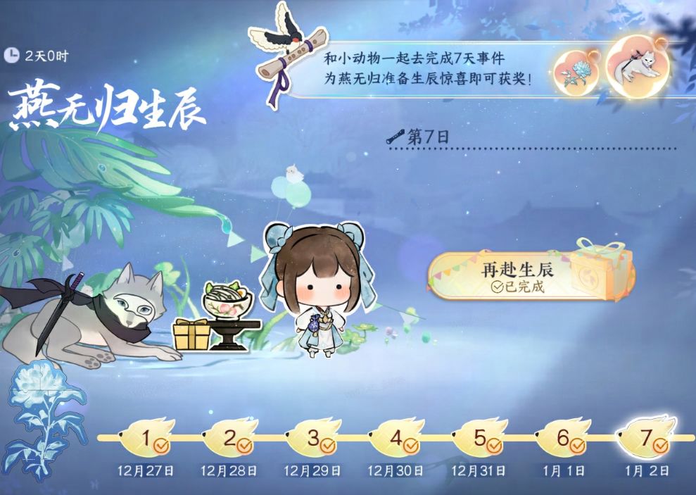 12月27日0时至1月5日0时,【燕无归生辰】活动正式开启!将按时序开放当天活动阶段,完成每日小玩法或对话均可获得不同奖励。各位女同门们届时可以前去参与~