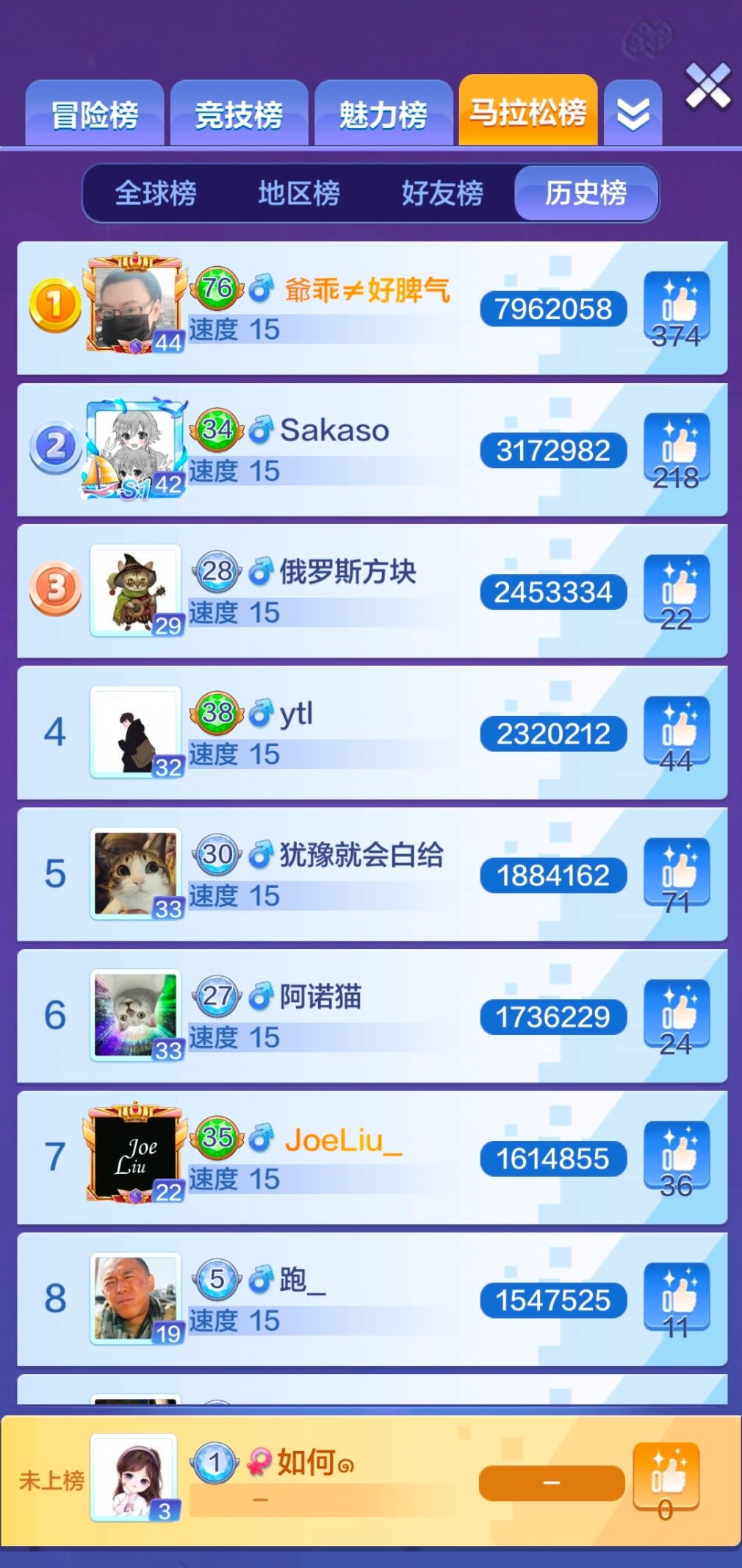 本次微信马拉松排行榜藏龙卧虎,“爷乖≠好脾气”以累积7962058总积分抢占第一,技术发挥稳定的他总能不断带来分数上的惊喜;“Sakaso”以3172982积分成功斩获第二;而“俄罗斯方块”以2453334积分成功挤入第三,但他与后续第四、第五的方块玩家距离也并不明显,想要稳住第三名,还是需要再接再厉一把。