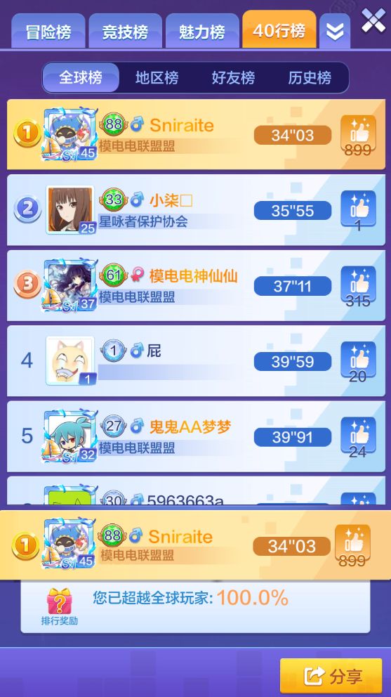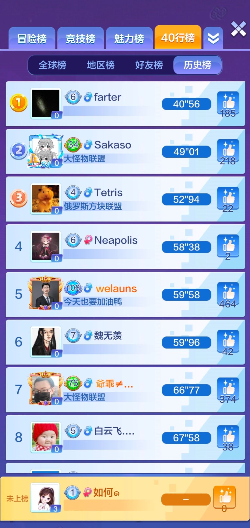 40行挑战赛是俄罗斯方块的经典玩法,方块玩家需要用最少的时间消除40行方块才能完成挑战,在七块儿眼里,霸榜的必然都是高手中的高高手。此次手Q测试40行全球排行榜中,“Sniraite” 以 34.03秒的成绩成功获得第一,他对于方块操控的精准落地让人倍感惊艳,在本次测试能拿第一在意料之中;第二名的“小柒”以35.55秒成绩斩获第二可谓实至名归,良好的大局观以及对方块组合的反应,让七块儿馋到没边了;第三名是的“模电电神仙仙”以37.11秒成功闯入前三,虽然相对于前两名他的成绩稍显落后,但七块儿觉得他的技术必然也是相当不错,更有晋升的可能哦!
