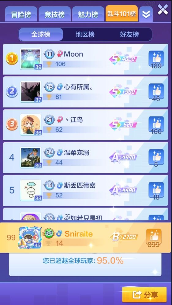 乱斗101是方块PVP的“吃鸡”战斗,既体现自己个战的英雄魅力,也彰显团队配合的螺丝钉精神,因此,它的排行榜也备受关注。手Q乱斗101排行榜战斗精彩纷呈,你方唱罢我登场。“Moon”以S段4820分获胜106场次排行第一名,他审时度势的大局观被小伙伴们津津乐道;“心有所属”以S段1980分获胜81场次区居第二名,他战斗风格狠辣作风犀利多变,是七块儿学习的榜样;而第三名“江鸟”以S段620分获胜62场次斩获,他的技术能力也总在关键处给七块儿惊喜哦。